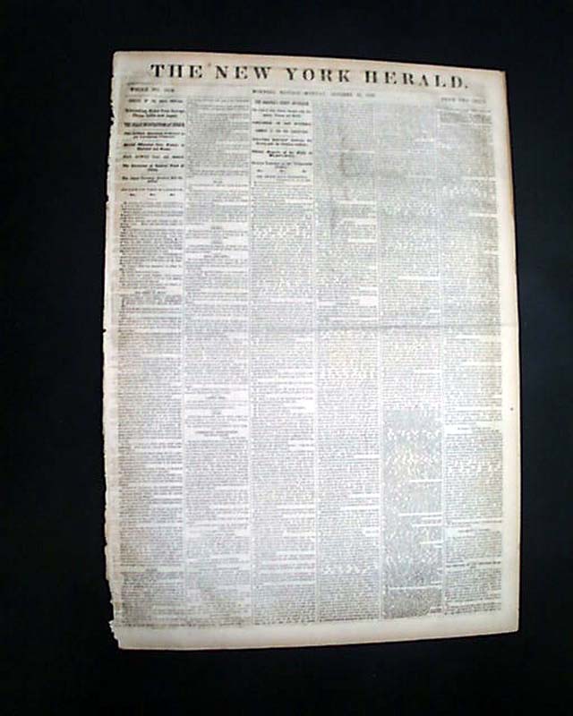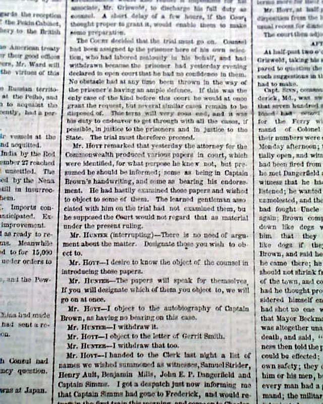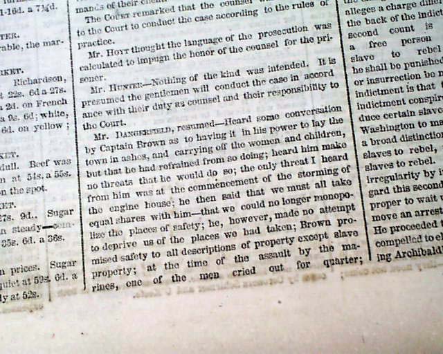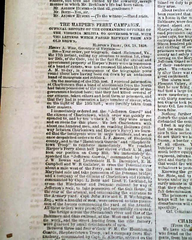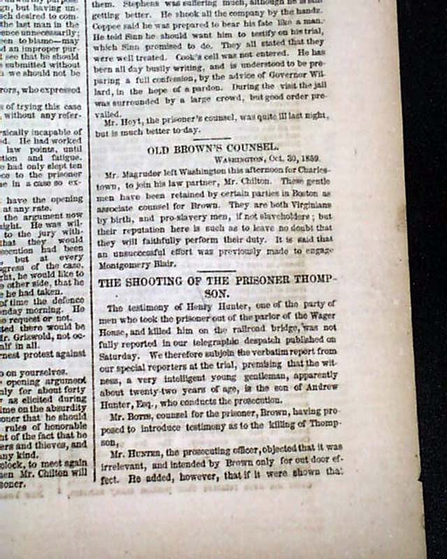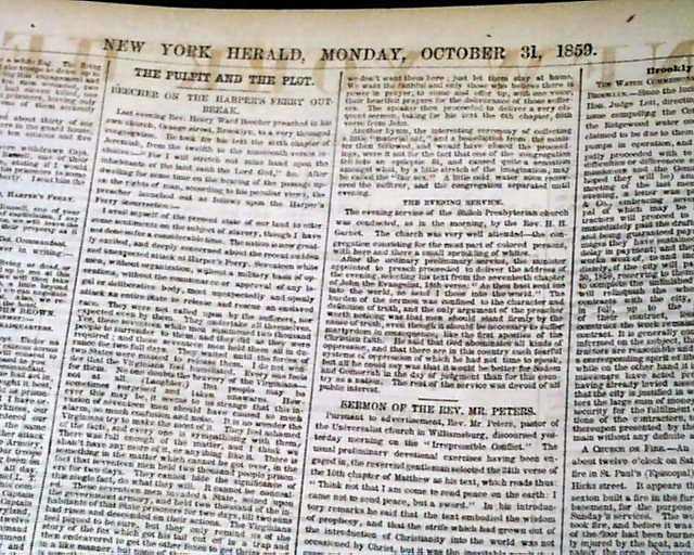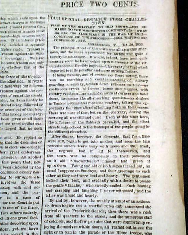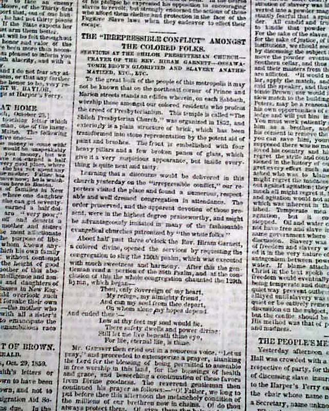 This coverage takes over half of the front page, carrying over to take over half of page 2 as well, with additional column heads including: "Our Special Despatch from Charlestown--Visit of the Military to Old Brown..." "Old Brown's Counsel" 'The Shooting of the Prisoner Thompson" "Gerrit Smith's Endorsement of Brown" "Black And Brown" 'Prayer For John Brown" "The Harper's Ferry Campaign" "The 'Irrepressible Conflict' Amongst the Colored Folks" "The Pulpit and the Plot - Beecher on the Harper's Ferry Outbreak" and even more.