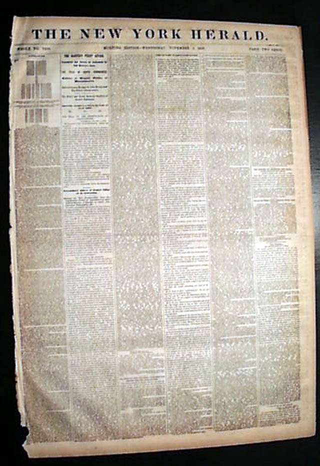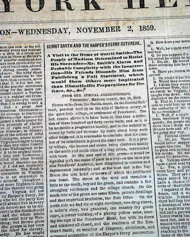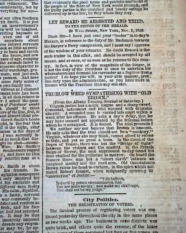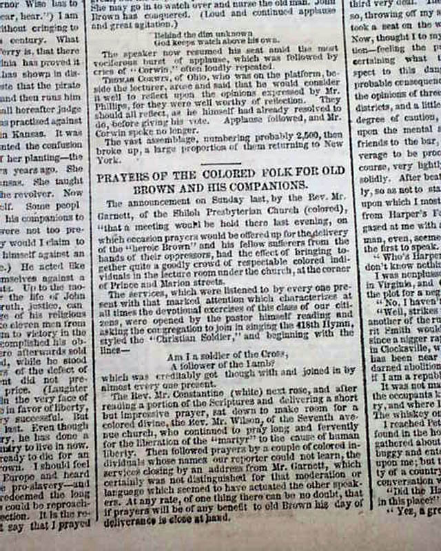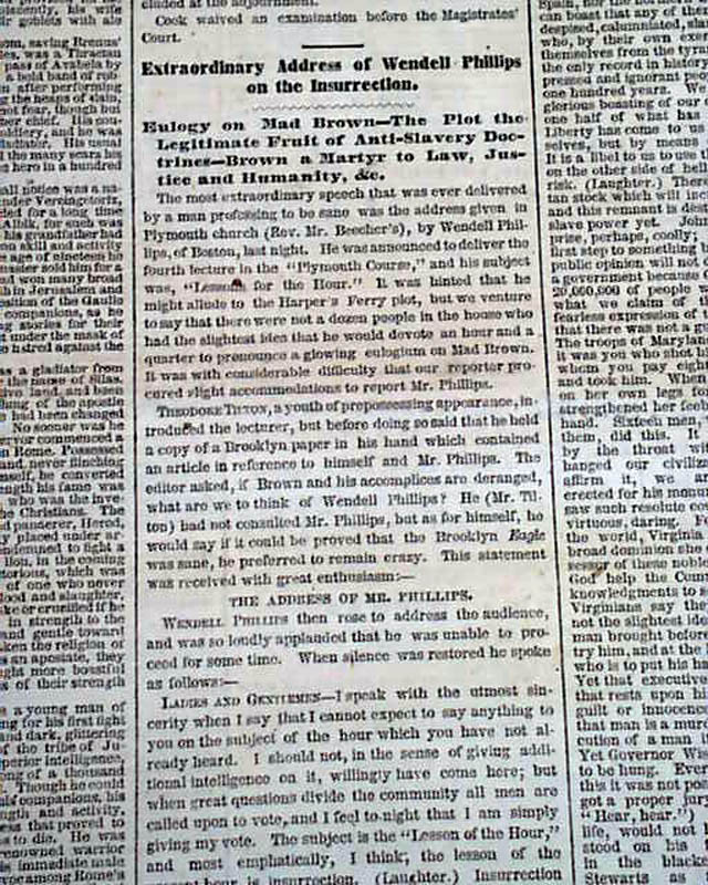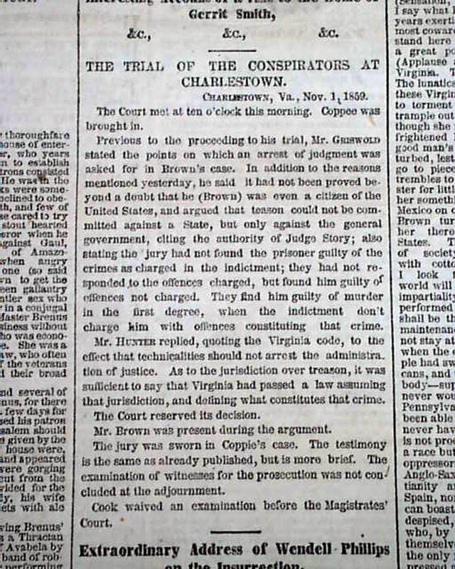 The front page has column heads including: "The Harper's Ferry Affair" "Argument for Arrest of Judgment in Old Brown's Case" "The Trial of Coppie [Coppic] Commenced" "Extraordinary Eulogy on John Brown & His Fellow Conspirators" "The Bloody and Brutal Rochester Manifesto of Seward Elaborated" and also: "Extraordinary Address of Wendell Phillips on the Insurrection" & "Garrit Smith and the Harper's Ferry Outbreak" "Prayers of the Colored Folk For Old Brown & His Companions" "Thurlow Weed Sypathising With 'Old Brown' ".