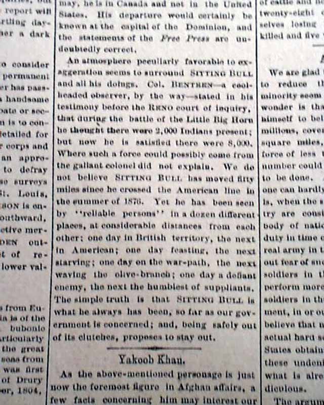THE MISSOURI REPUBLICAN, St. Louis, Feb. 6, 1879 Page 4 has an interesting editorial headed: "Sitting Bull" which relates to his return to American soil from Canada, or as offered here, he has yet to do so.