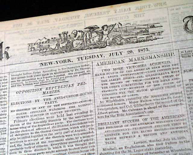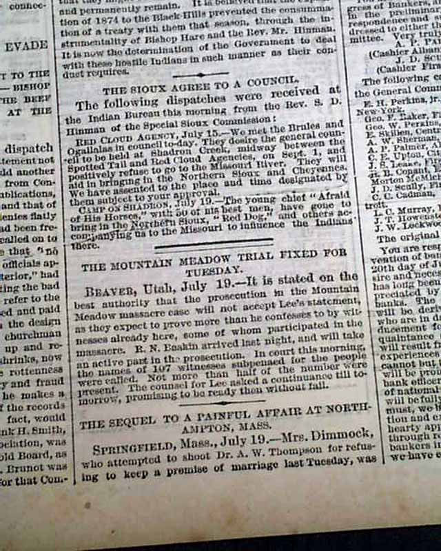 NEW YORK TRIBUNE, July 20, 1875  The bottom of the front page has a brief report: "The Mountain Meadow Trial Fixed For Tuesday" with a dateline from Beaver, Utah.
