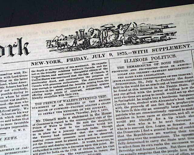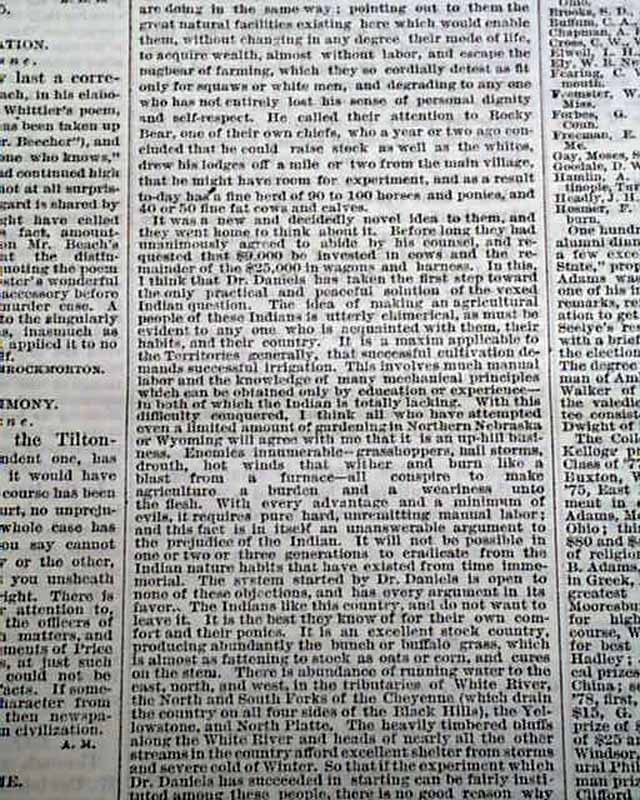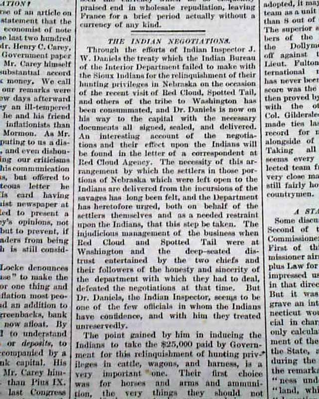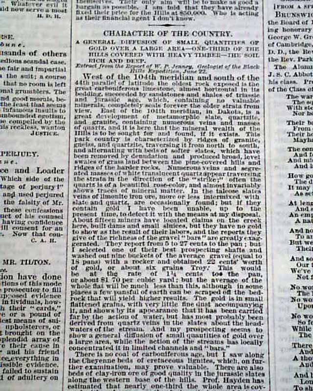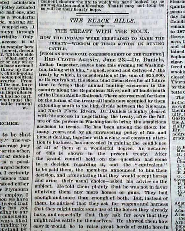 NEW YORK TRIBUNE, July 9, 1875 Page 3 has: "The Black Hills" "The Treaty With the Sioux" "How the Indians Were Persuaded to Make the Treaty--Wisdom of Their Action in Saying Cattle". This is followed by: "Character of the Country" "General Diffusion of Small Quantities of Gold Over a Large Area--One-Third of the Hills Covered with Heavy Timber--The Soil Rich & Deep".
