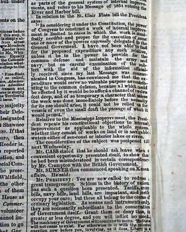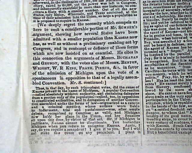 The May 21 issue then continues with: "Mr. Sumner, resuming his speech begun yesterday, , proceeded as follows: From this ample survey, where one obstruction after another has a been removed, I now pass...to the consideration of the various remedies proposed ending with the True Remedy...". Much text follows, and again the Tribune injects a sidebar note beginning: "We deeply regret the necessity which compels us here to omit a considerable portion of Mr. Sumner's argument...Mr. S. continued: This, in that day, by such triumphant votes, did the cause of Kansas prevail..." and continues on through the end of his speech, it ending with: "...of Freedom crushed to earth; and in the name of the Heavenly Father, whose service is perfect Freedom, I make this last appeal."