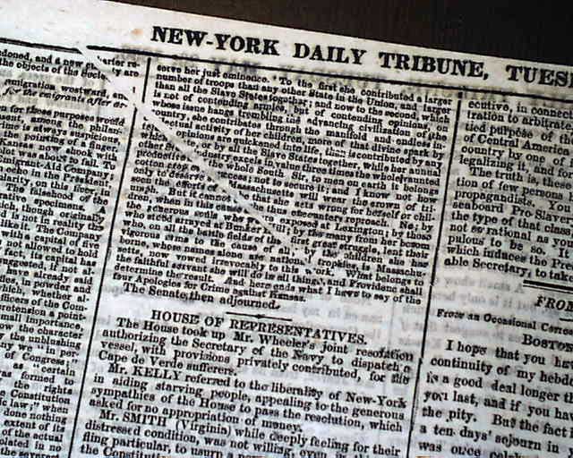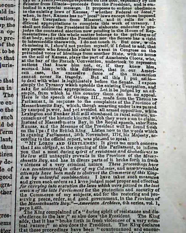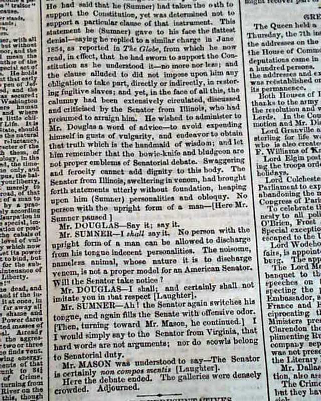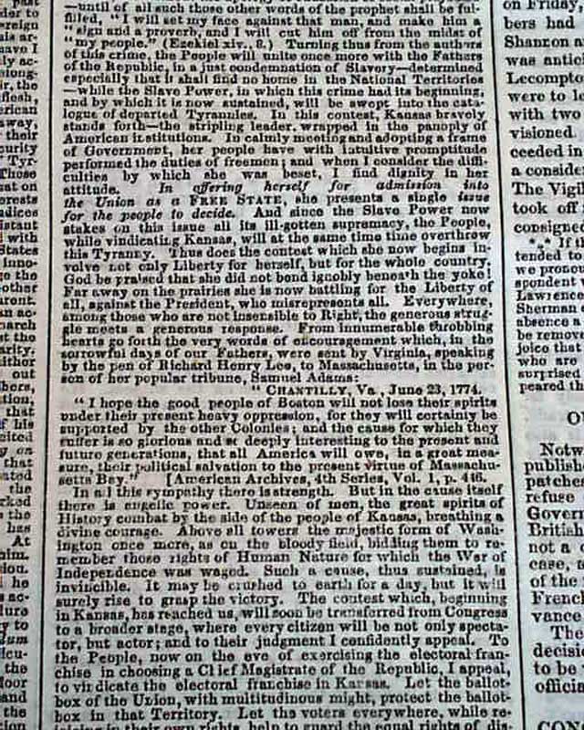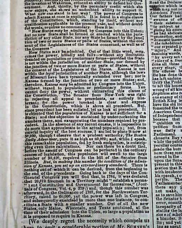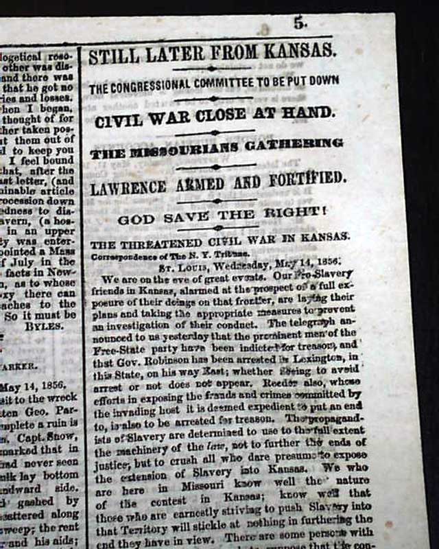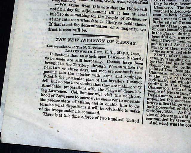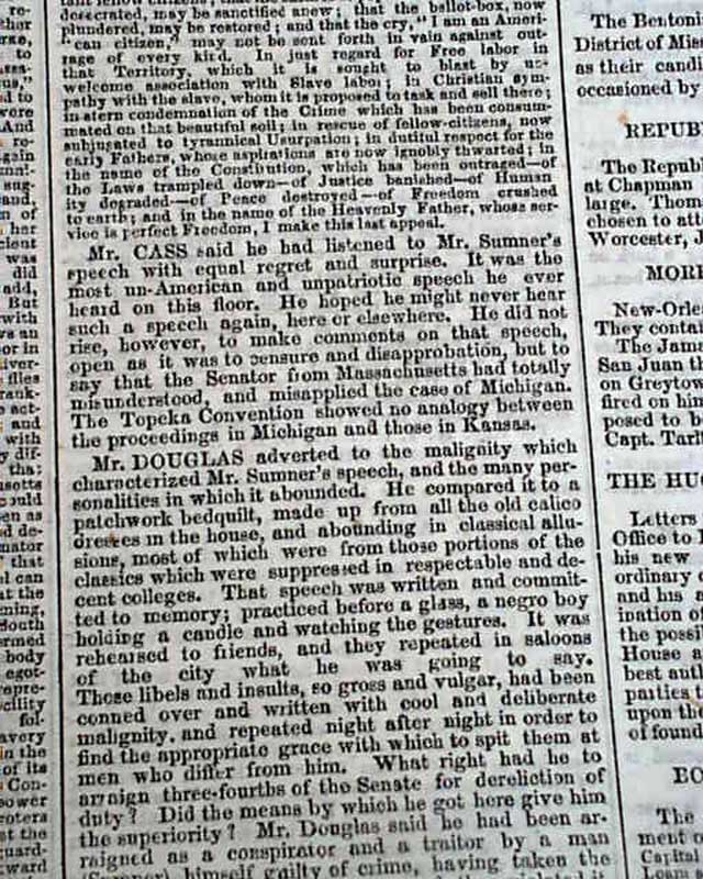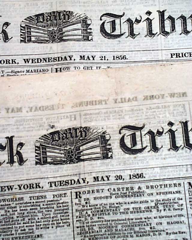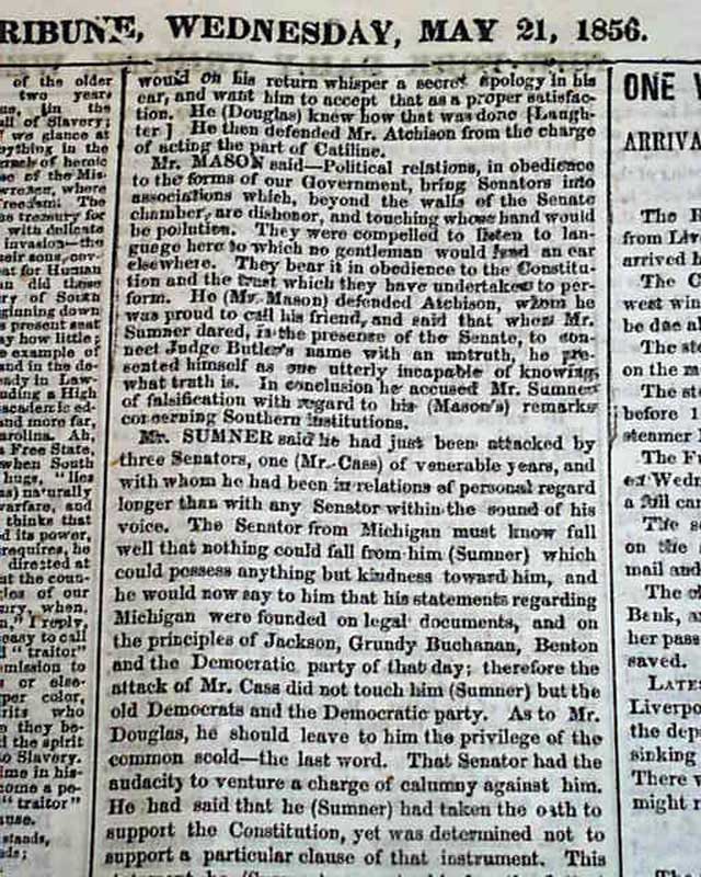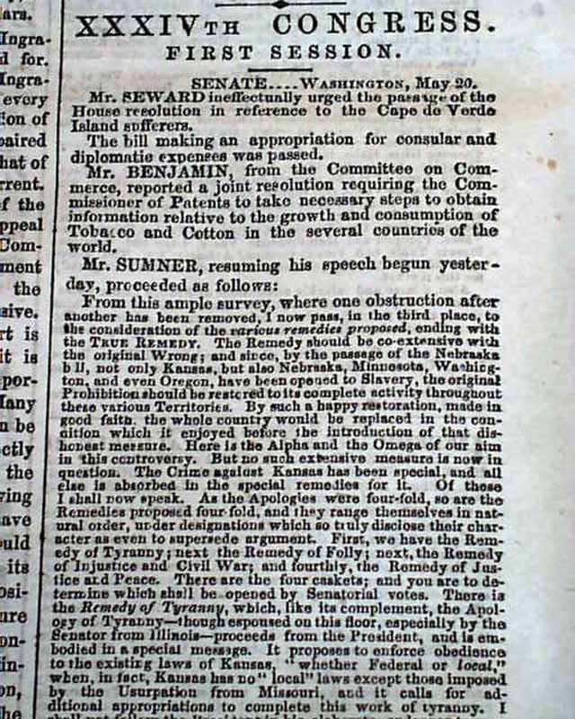 (2-issue set) NEW YORK TRIBUNE, May 20 and 21, 1856  On May 19 and 20, 1856, Senator Charles Sumner of Mass. delivered a powerful speech to the Senate in which he condemned Southerners and politicians who advocated the expansion of slavery into new territories, especially Kansas. It has become famous in history as the "Crimes Against Kansas" speech.