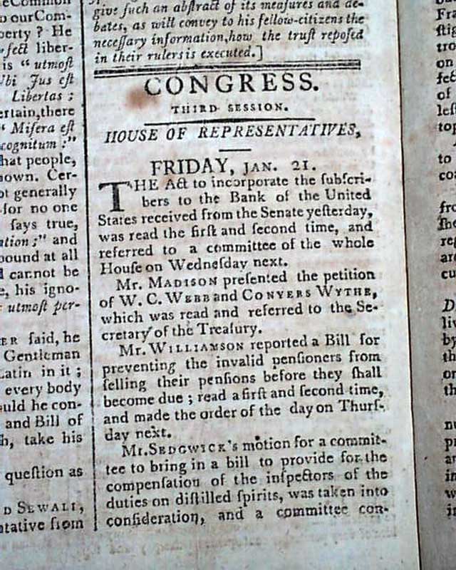 The entire front page & most of page 2 are taken up with the: "Debate on the Ineligibility of Federal Judges", in the Massachusetts Legislature. Page 2 has mention from "Congress" that the Act to incorporate the Bank of the United States was read the first & second time.