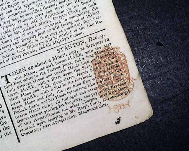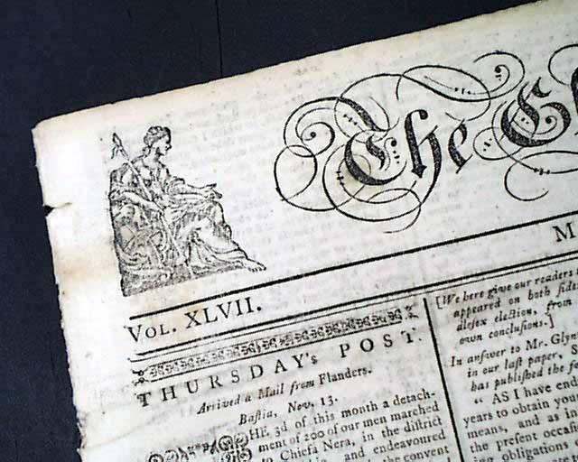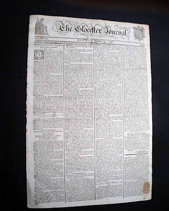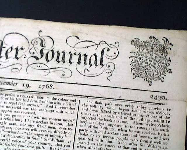 THE GLOCESTER JOURNAL, England (now spelled Gloucester), Dec. 19, 1768 Various British news reports throughout, with its finest feature being the handsome masthead with two detailed engravings and the ornate lettering. This is from the period when the troubling relationship between England and America was coming to a head. The Boston Massacre would be less than 2 years away.
