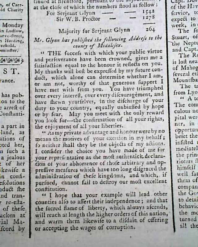 Page 2 has a piece of a letter, not specific to America but rather to the administration of some counties in England, although there are overtones on his the American colonies are being treated: "...I consider the choice you have made of me for your representative was the most authentic, declaration of your abhorrence of those arbitrary & oppressive measures which have too long disgraced the administration of these kingdoms, and which, if pursued, cannot fail to destroy our most excellent constitution. I hope that your example will lead other counties also to assert their independence; and that the sacred flame of liberty, which always ascends, will reach at lengthy the higher orders of this nation, and warm them likewise to a disdain of offering or accepting the wages of corruption."