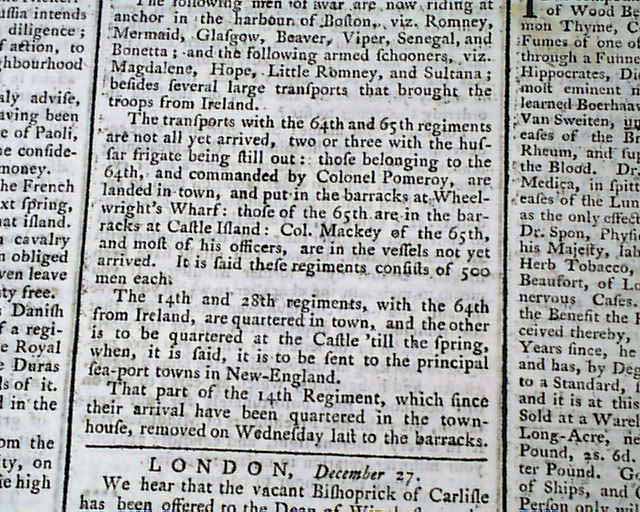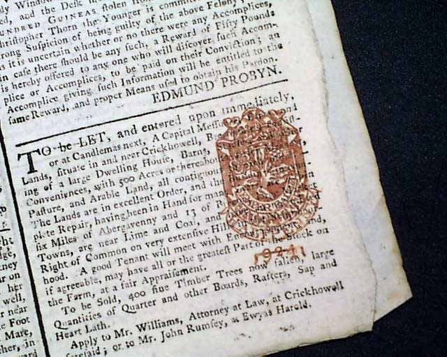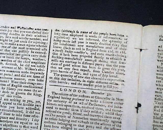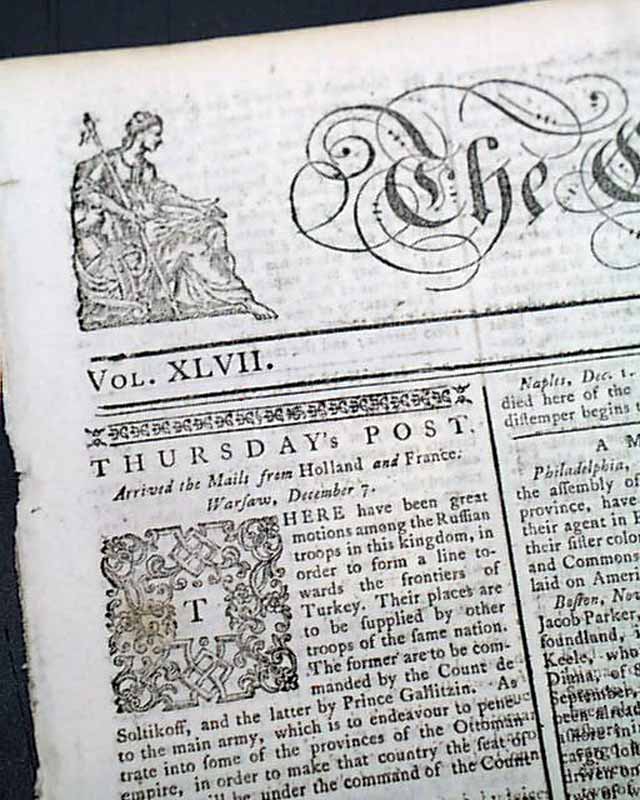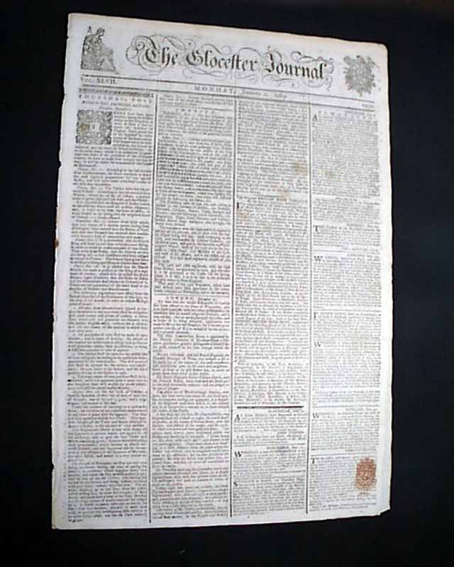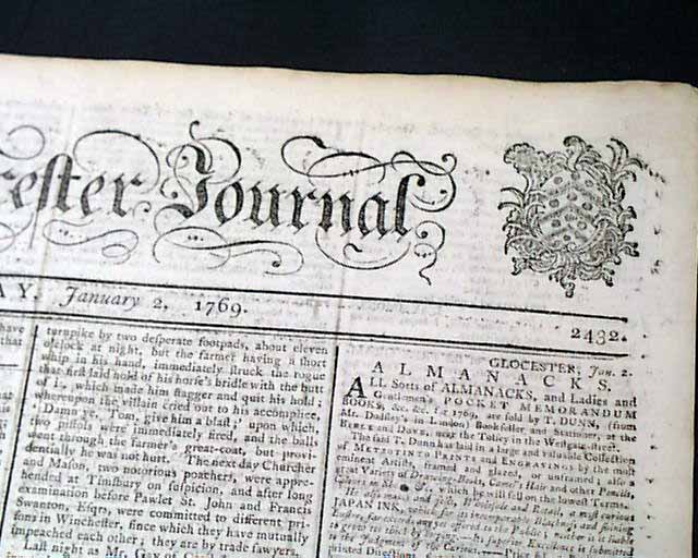 THE GLOCESTER JOURNAL, England (now spelled Gloucester), Jan. 2, 1769 Various British news reports throughout, with its finest feature being the handsome masthead with two detailed engravings and the ornate lettering. This is from the period when the troubling relationship between England and America was coming to a head. The Boston Massacre would be less than 2 years away.
