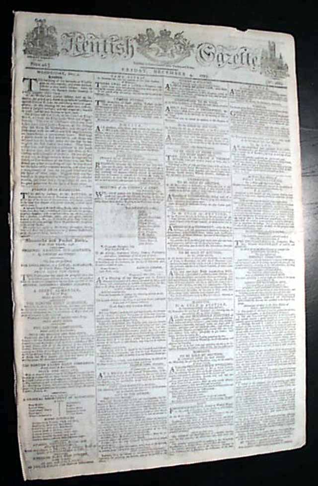 KENTISH GAZETTE, Canterbury, England, Dec. 4, 1795 A handsome issue of the 18th century from this famous town, with two decorative embellishments in the masthead & ornate lettering in the title. Various British news & ads of the day with a partial red tax stamp on page 3.