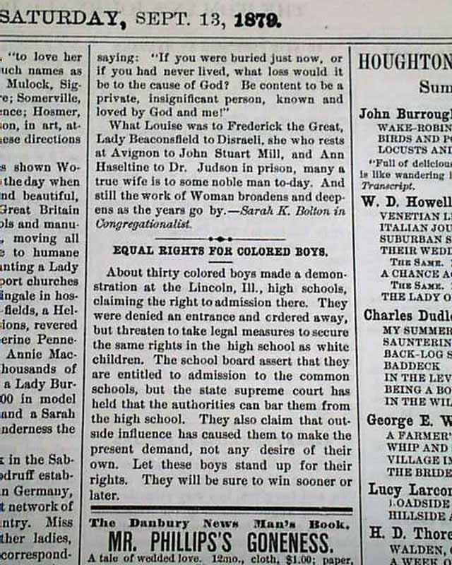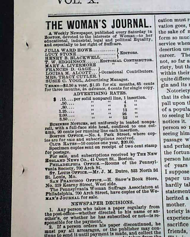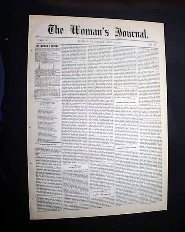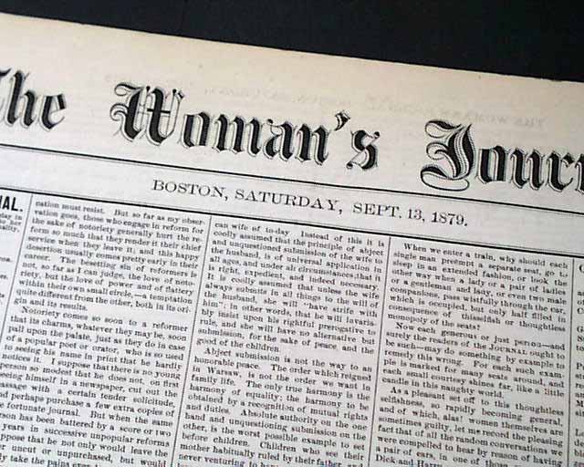 THE WOMAN'S JOURNAL, Boston, Sept. 13, 1879 Uncommon women's suffrage paper produced by--among others--Lucy Stone, Alice Blackwell, Julia Ward Howe, and Mary Livermore.