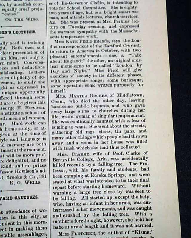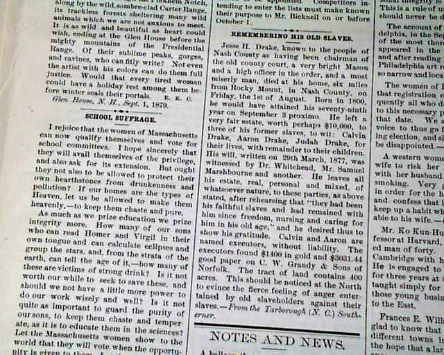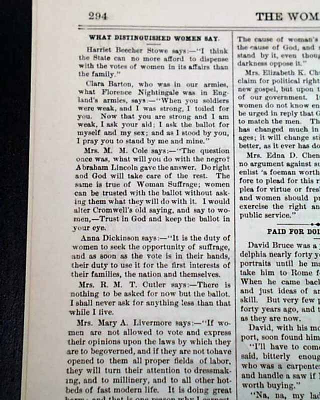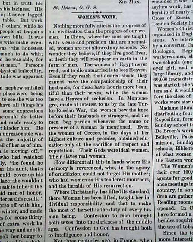 Among the articles: "Concerning Women" "Women's Work" "Equal Rights For Colored Boys" "Women's Work In the Church" "School Suffrage" "Remembering His Old Slaves" and much more.