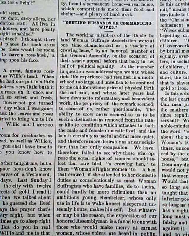 Among the articles: "Concerning Women" "The Political Ignorance of Women" "Obeying Husbands Or Commanding Wives" "Women Voters In Boston" and much more.
