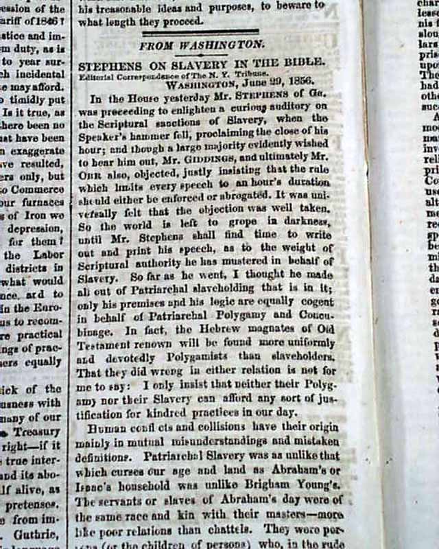 Also within: "Stephens On Slavery In the Bible" as well as content on Bleeding Kansas with: "KANSAS - The Alarm In Fort Scott" and: "Dragoonage" which is a report from Lawrence, Kansas Territory. Also a report: "The Alleged Slaver Barman", the slave ship.