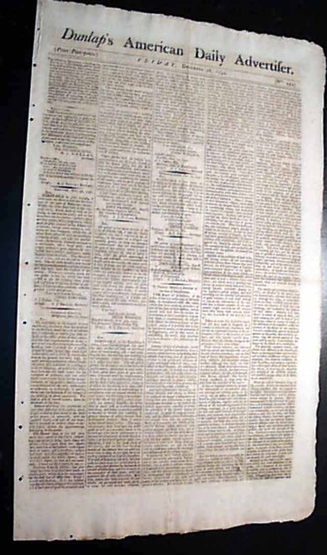 DUNLAP'S AMERICAN DAILY ADVERTISER, Philadelphia, Dec. 28, 1792 If you are looking for a very nice, typical American newspaper of the late 1700's, here's a great one for a modest price. A four page issue with a nice mix of news of the day and advertisements.