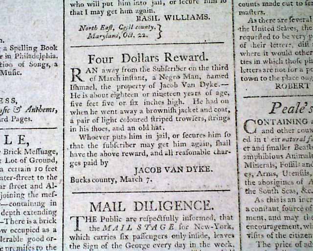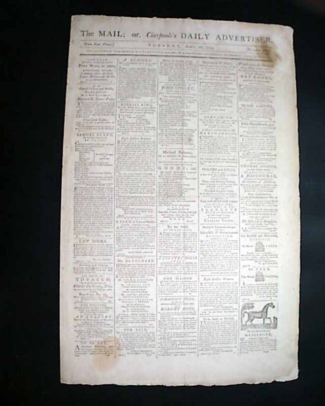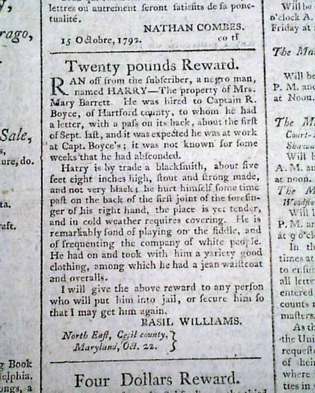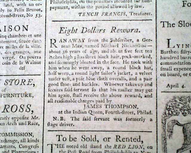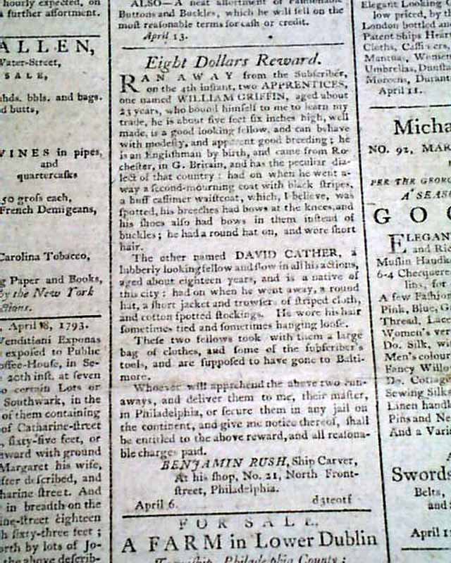 THE MAIL; OR CLAYPOOLE'S DAILY ADVERTISER, Philadelphia, April 16, 1793 A typical newspaper of the day from during George Washington's administration. Inside has several runaway reward ads, with details.
