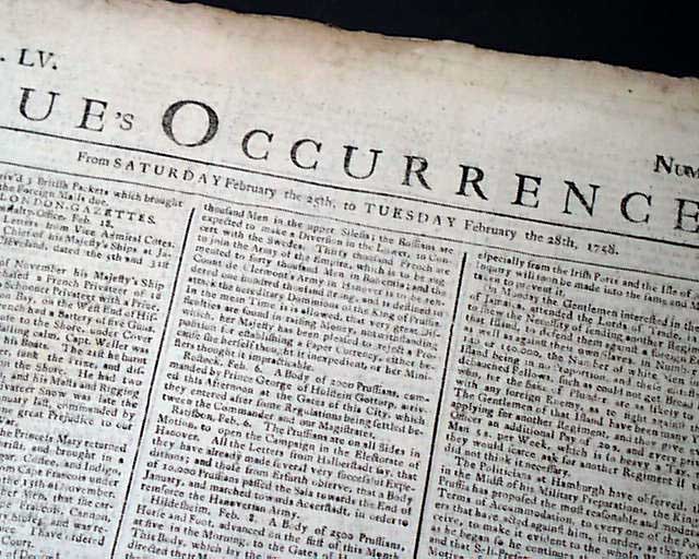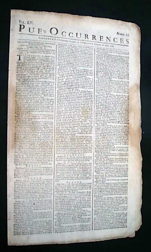 PUE'S OCCURRENCES, Dublin, Ireland, Feb. 28, 1758  An early Irish newspaper with various news reports from throughout Europe with some ads & notices as well.