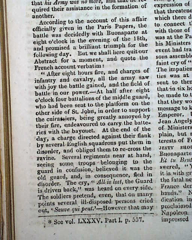 Further on the detailed account includes: "...but we shall here quit our Abstract for a moment and quote the French account verbatim..." and what follows is the French account of Waterloo. This report takes over two full pages.