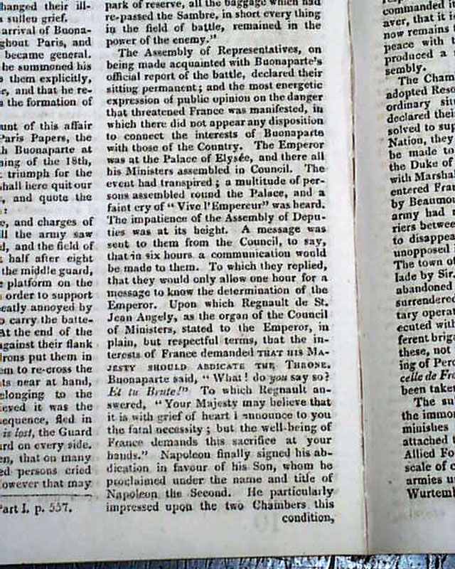 Under the heading "France" is a lengthy report that begins: "The second abdication of the Throne of France by Napoleon Buonaparte was alluded to in our last number, & has since received full confirmation. We must, however, take up the tread of our Abstract at the period immediately following the great Battle of Waterloo witnessing the irretrievable rout of his troops in the dreadful engagement on the 18th..." with much more.