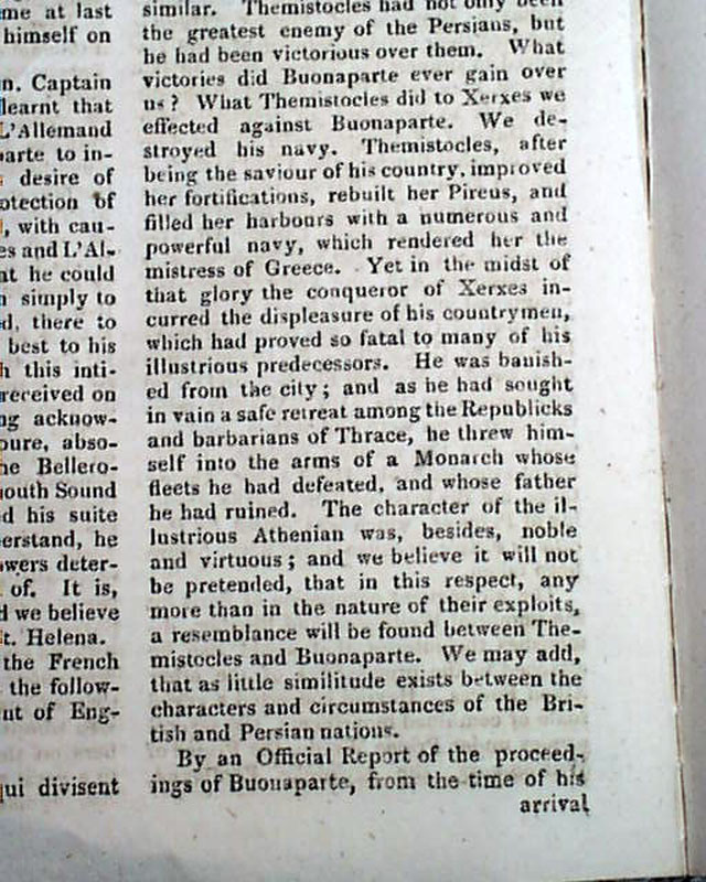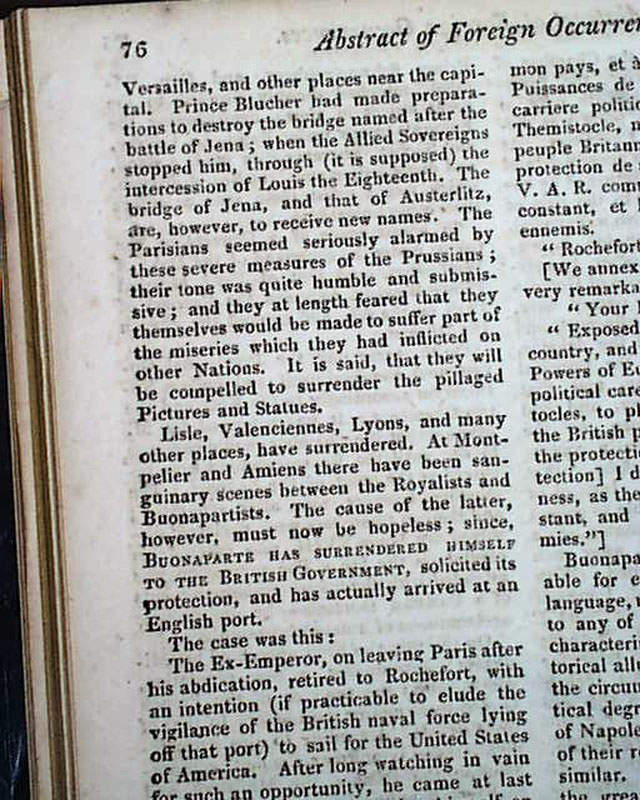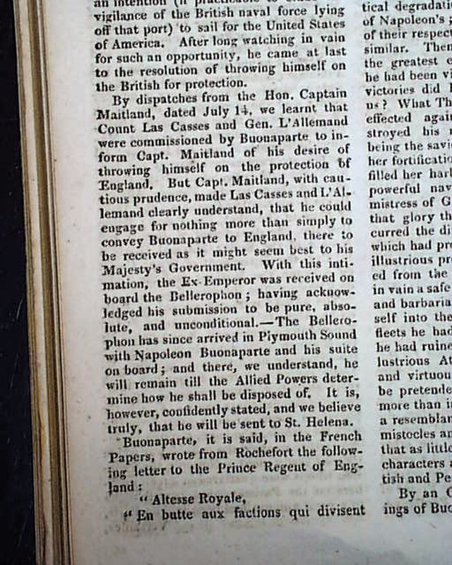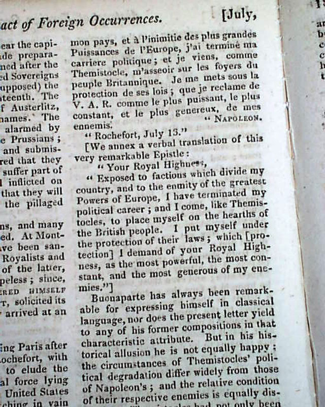 Near the end is: "...cause of the latter, however, must now be hopeless since Buonaparte has surrendered himself to the British government, solicited its protection, and has actually arrived at an English port..." and also a letter signed: Napoleon, which, translated, includes: "...I have terminated my political career; and I come, like Themistocles, to place myself on the hearths of the British people...".