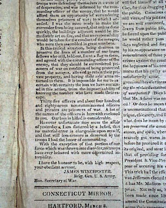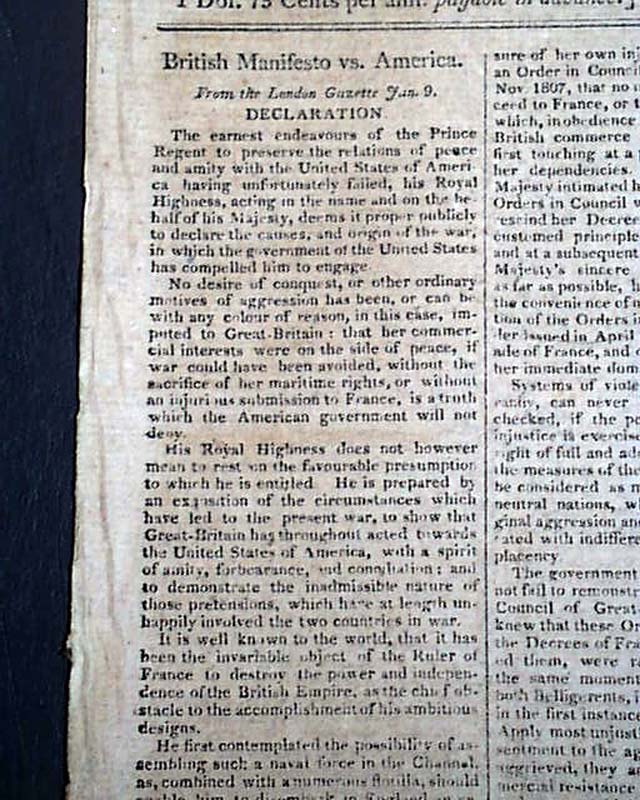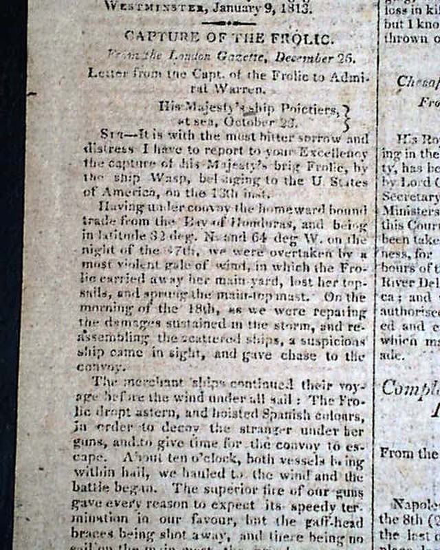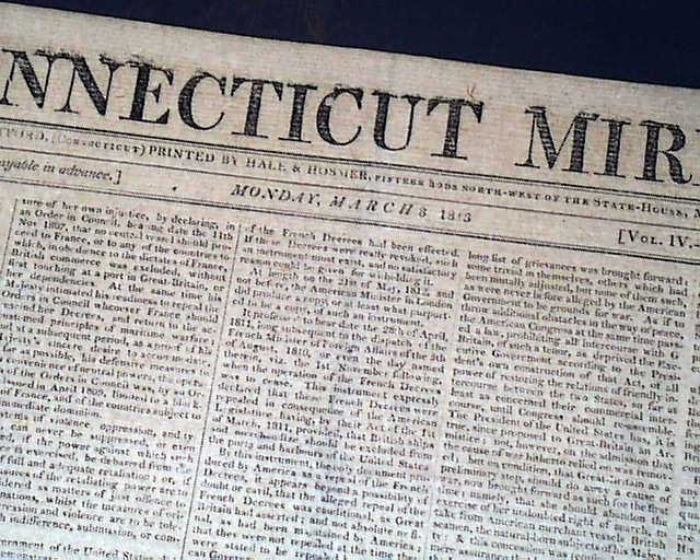 CONNECTICUT MIRROR, Hartford, March 8, 1813  The entire front page is taken up with a "Declaration" headed: "British manifesto vs. America". Inside has: "Capture of the Frolic" by the U.S. ship Wasp, followed by: "Capture of the Macedonian" by the ship United States.