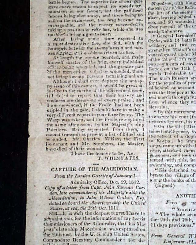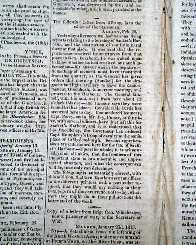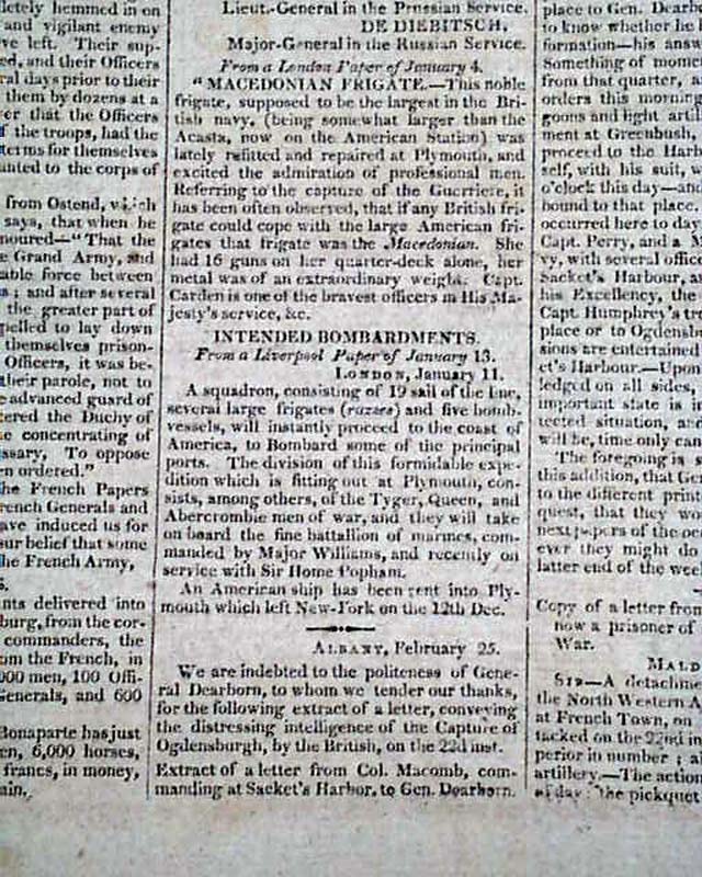 Also: "Macedonian Frigate", and a letter from Albany beginning: "Yesterday afternoon we had various flying reports relating to the burning of Sacket's Harbour & the destruction of our little naval force at that place...", followed by a letter from Brig. Gen. Winchester as a prisoner of war. There is also much reporting on the war in Europe.