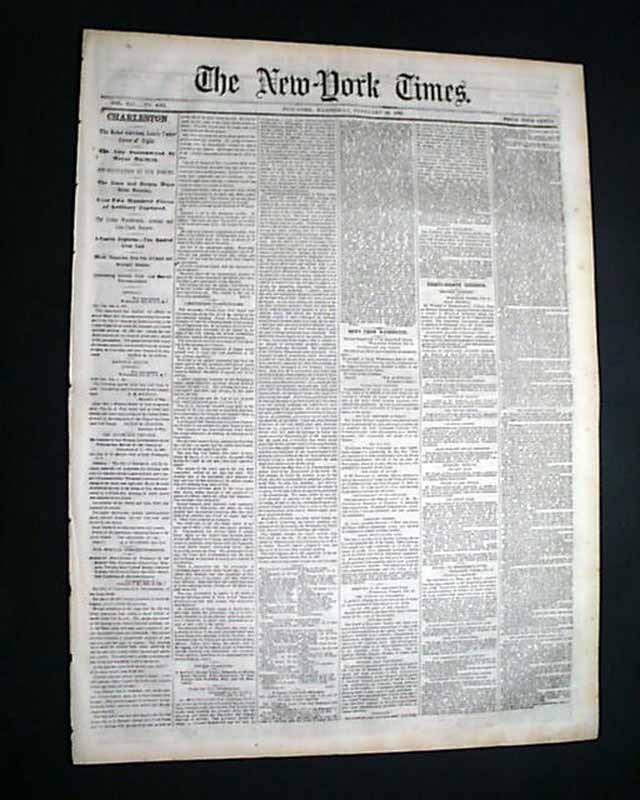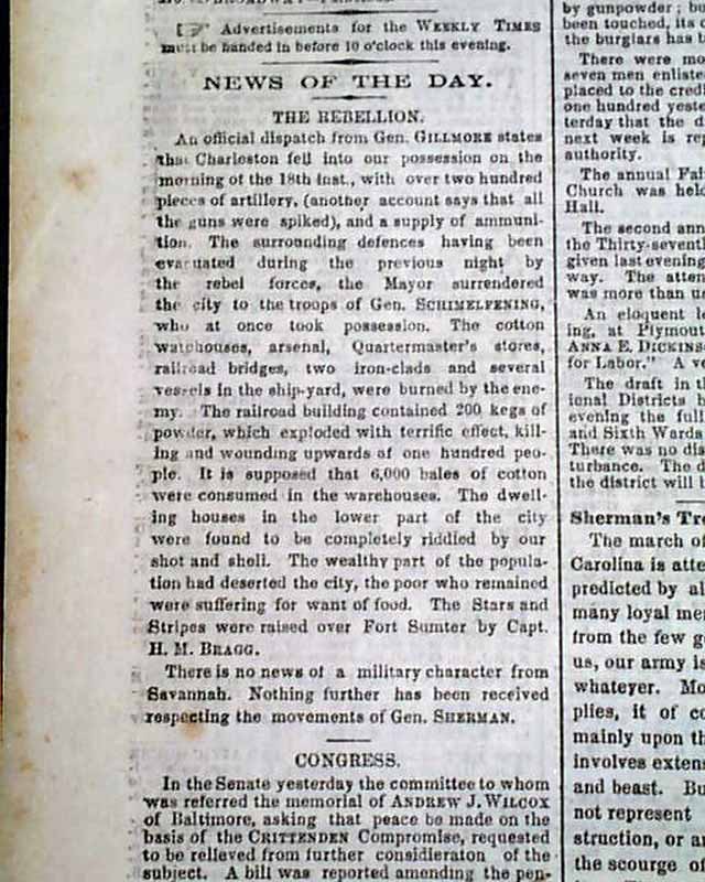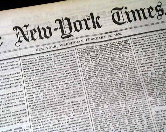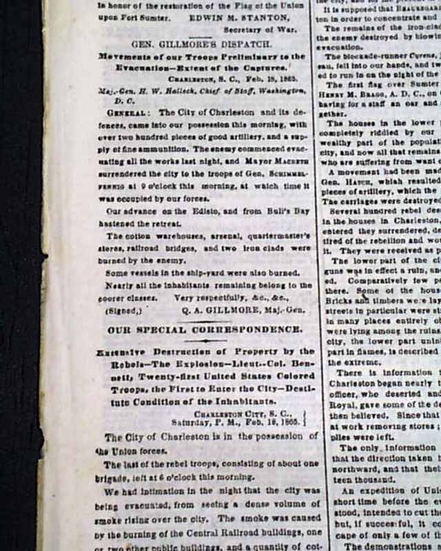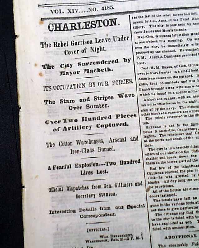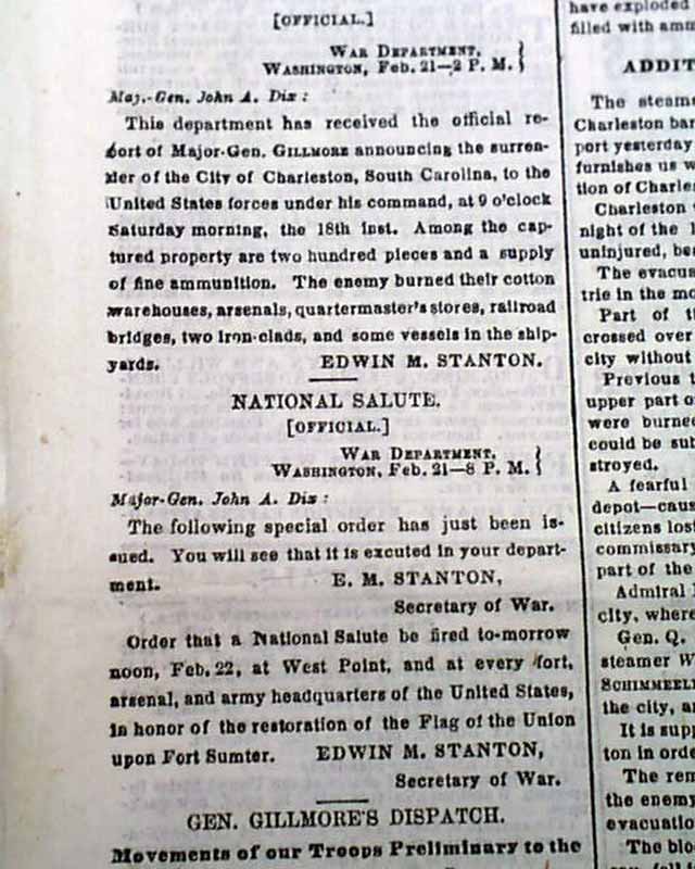 NEW YORK TIMES, Feb. 22, 1865   Among the front page column headlines on the Civil War are: "CHARLESTON" "The Rebel Garrison Leave Under Cover of Night" "The City Surrendered by Mayor Macbeth" "ITS OCCUPATION BY OUR FORCES" "The Stars and Stripes Wave Over Sumter" "Over Two Hundred Pieces of Artillery Captured" and more.
