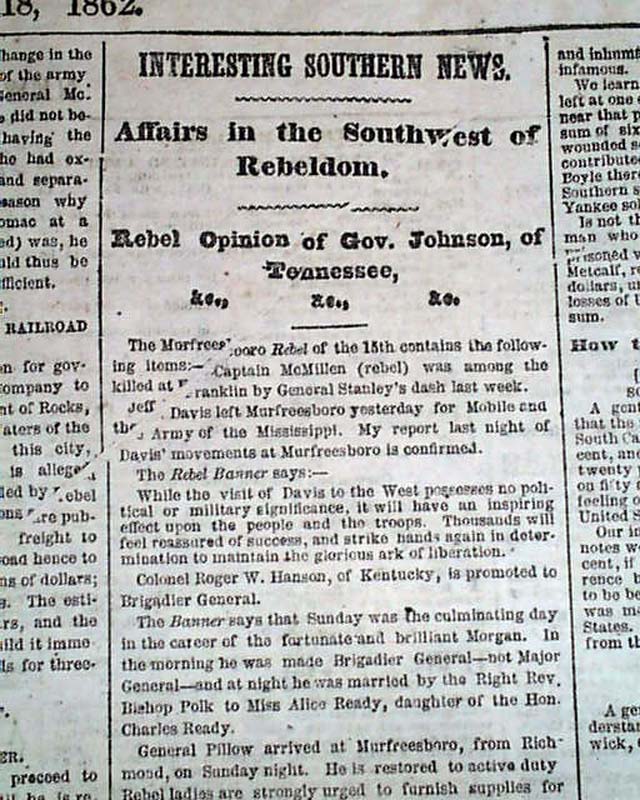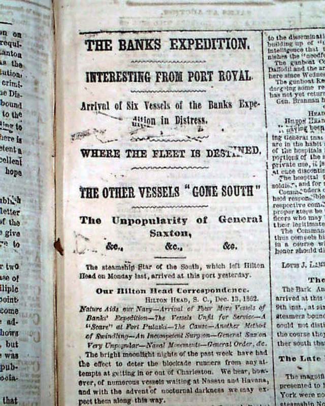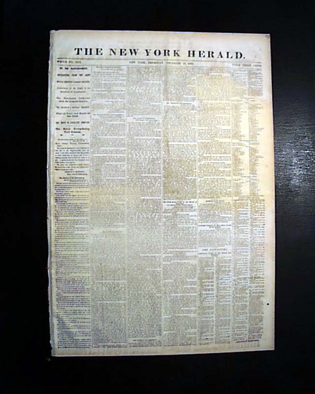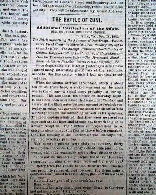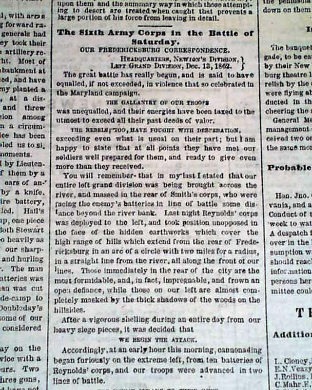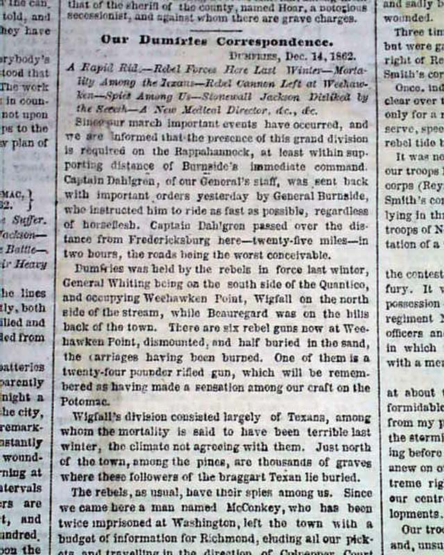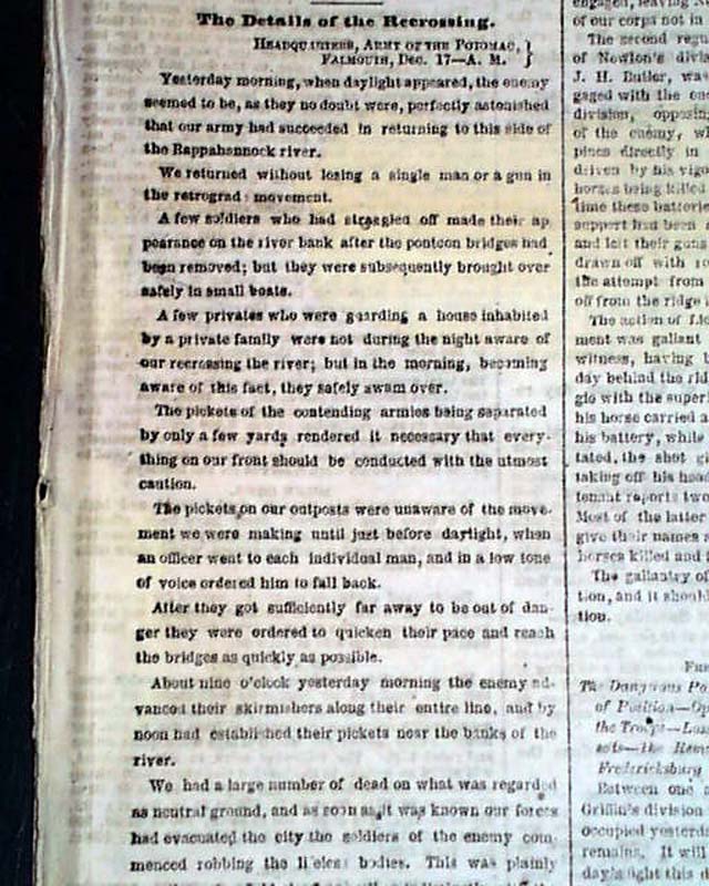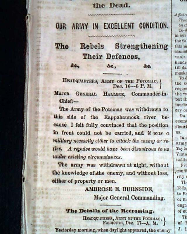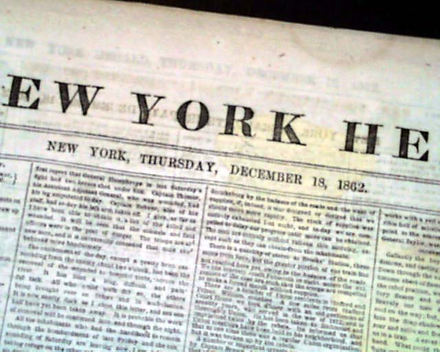 NEW YORK HERALD, December 18, 1862 Among the front page column heads on the Civil War are: "On The Rappahannock" "Special Dispatch From Gen. Burnside" "Astonishment of the Rebels at Our Recrossing the Rappahannock" "Flags of Truce & Burial of the Dead" "The Rebels Strengthening Their Defences" and more.