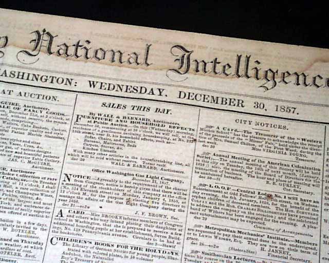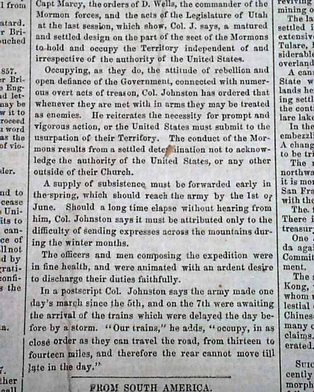 DAILY NATIONAL INTELLIGENCER, Washington, D.C., Dec. 30, 1857 Page 3 has: "The Army In Utah" which reports on the advance of U.S. troops towards Utah, noting: "... the numerous [wagon] trains guarded by it, reached there...The march was slow & tedious, averaging only 11 miles a day...