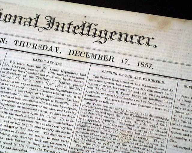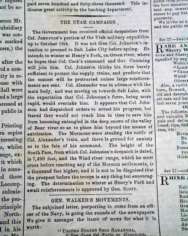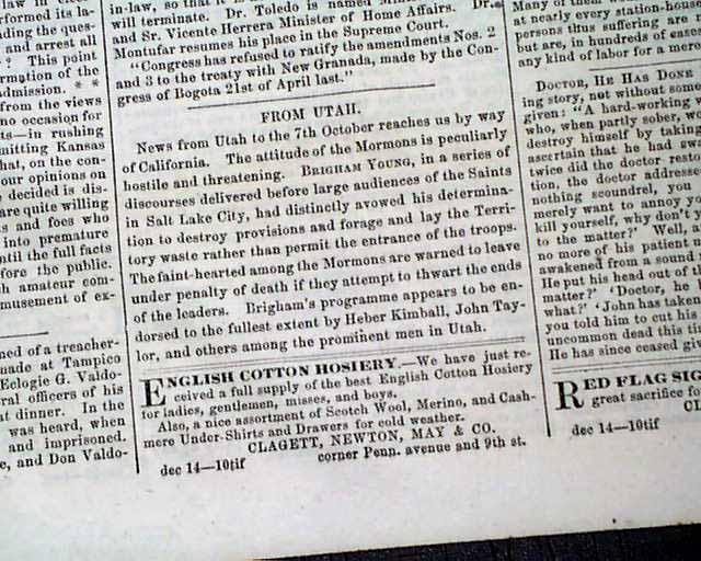 DAILY NATIONAL INTELLIGENCER, Washington, D.C., Dec. 17, 1857  The front page has two Mormon-related articles: "From Utah" which notes in part: "...The attitude of the Mormons is peculiarly hostile and threatening...Brigham Young...had distinctly avowed his determination to destroy provisions & forage and lay the Territory waste rather than permit the entrance of the troops..." with more.