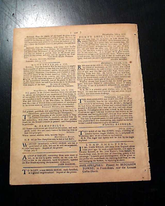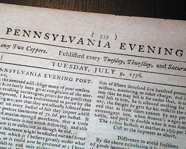 THE PENNSYLVANIA EVENING POST, July 9, 1776 This was the very first issue this title published after the issue of July 6 (was a tri-weekly) which contained the very first printing of the Declaration of Independence in any newspaper.