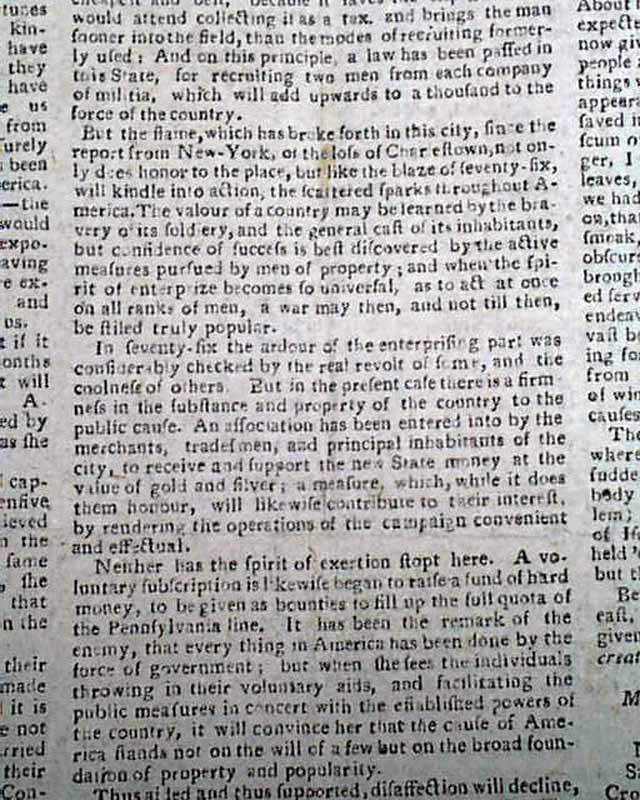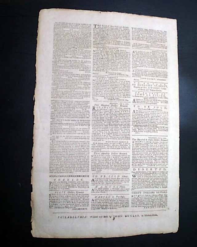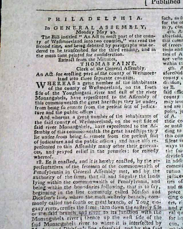 Coincidently the front page has a short document with a signature of "Thomas Paine, Clerk of the General Assembly" of Pennsylvania, a post he held for a period of time.A rarity to find an American newspaper with a complete printing of a Crisis essay as they were often partitioned over several issues.