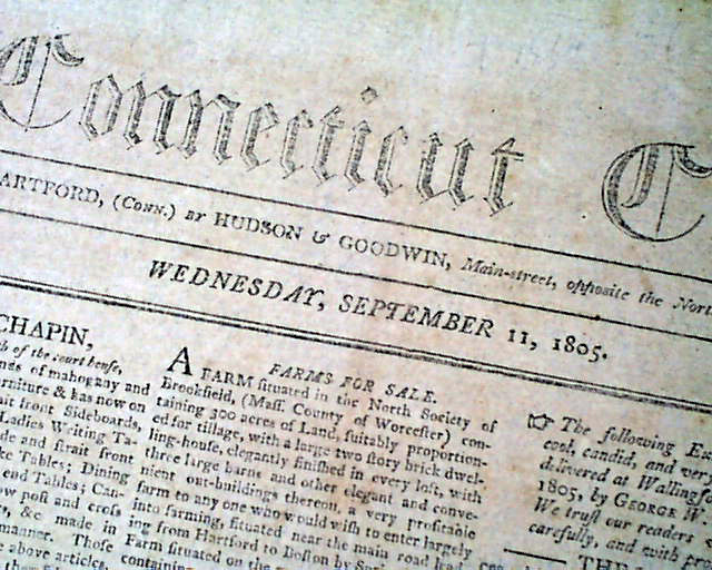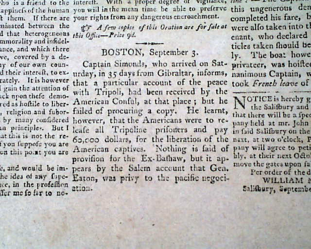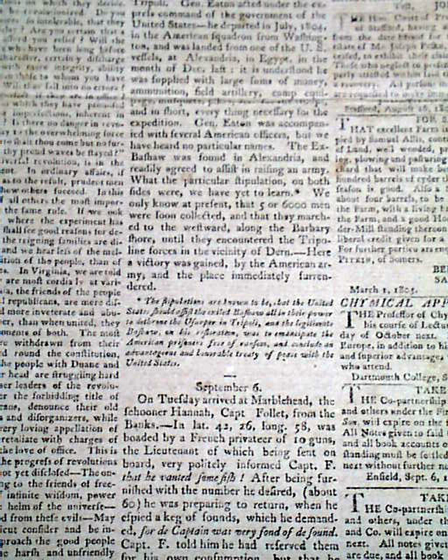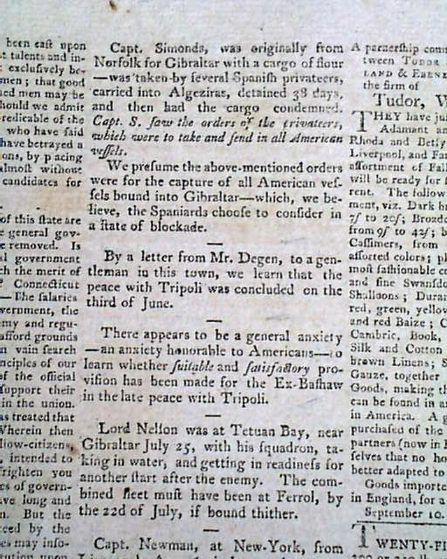 THE CONNECTICUT COURANT, Hartford, Sept. 11, 1805 Page 2 has a report beginning: "Captain Simonds, who arrived one Saturday in 35 days from Gibraltar, informs that a particular account of the peace with Tripoli has been received by the American Consul...". Also an article headed: "Of Tripoli", all relating to the First Barbary War.