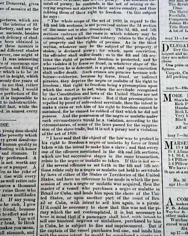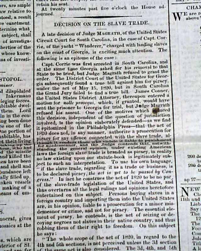 NATIONAL INTELLIGENCER, Washington, D.C., May 15, 1860 Page 2 has over half a column taken up with: "Decision On The Slave Trade" which deals with the rather infamous case of the slave ship 'Wanderer', about which much can be found online.