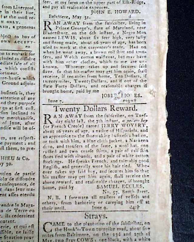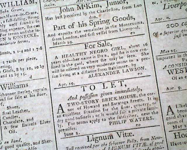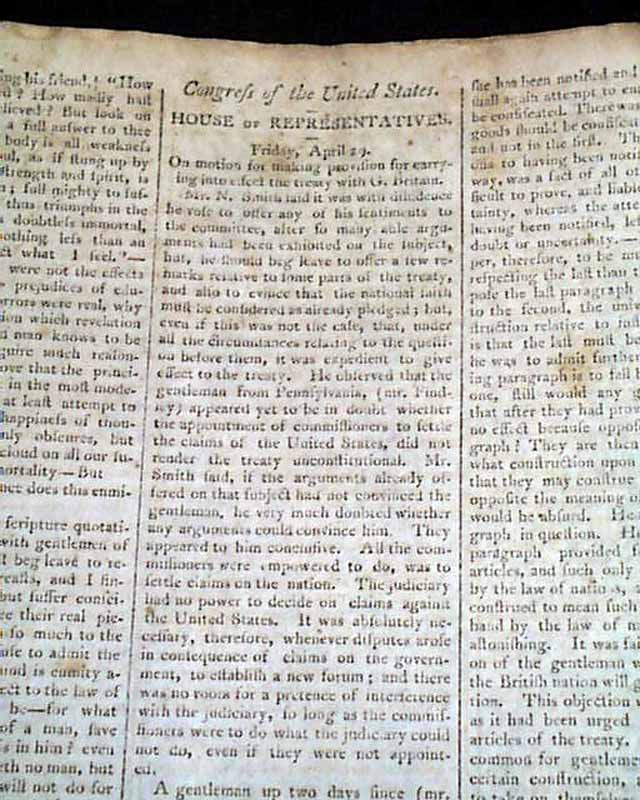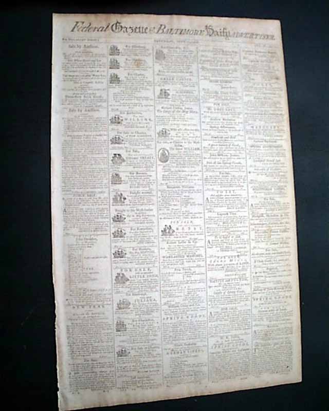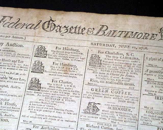 FEDERAL GAZETTE & BALTIMORE DAILY ADVERTISER, Maryland, June 11, 1796 Much of pages 2 and 3 are taken up with reports from Congress concerning debates on the controversial Jay Treaty with England. Also 20 illustrated ship ads.