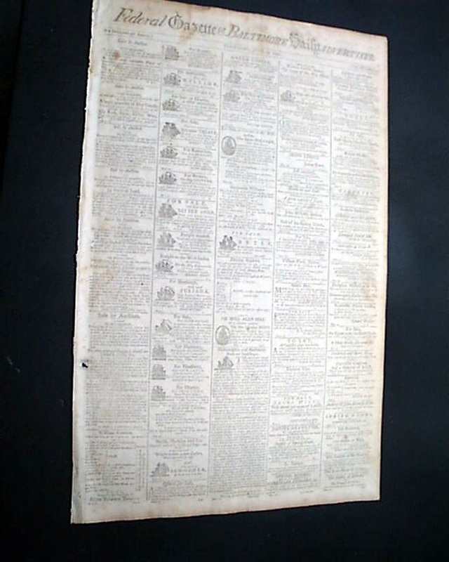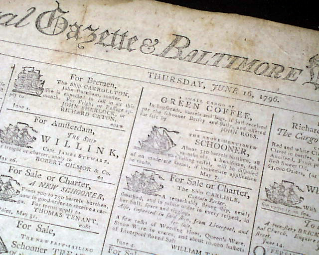 FEDERAL GAZETTE & BALTIMORE DAILY ADVERTISER, Maryland, June 16, 1796 The front page features 22 illustrated ship ads.