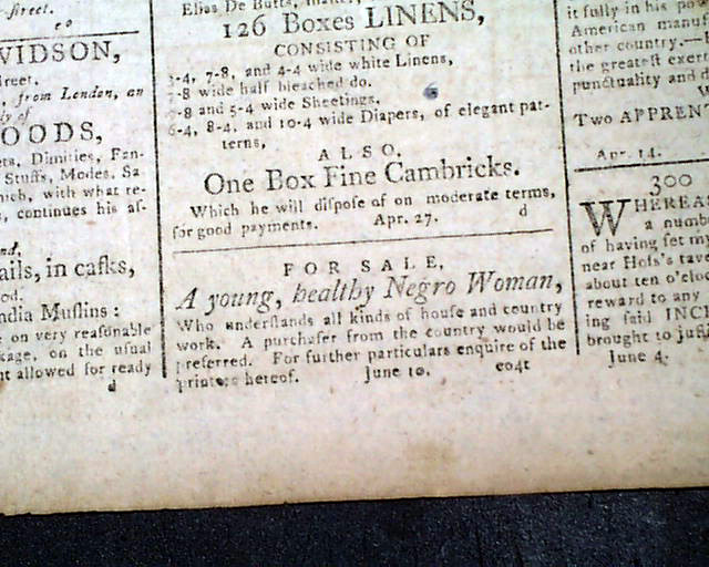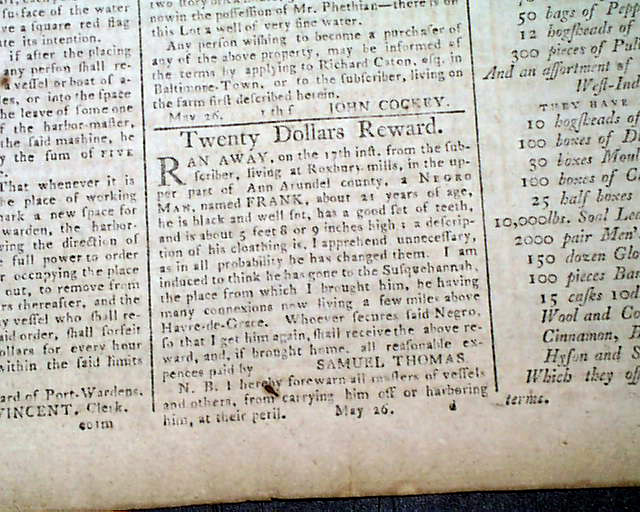 Page 3 has an ad: "For Sale: A young, healthy Negro Woman..." with details, and the back page has an ad for: "Negro Tom" describing: "A Black Man, about 5 feet 6 inches high...ran off from Fell's Point on Sunday..." then describing his clothing, etc. Also a: "Twenty Dollars Reward" ad with details.