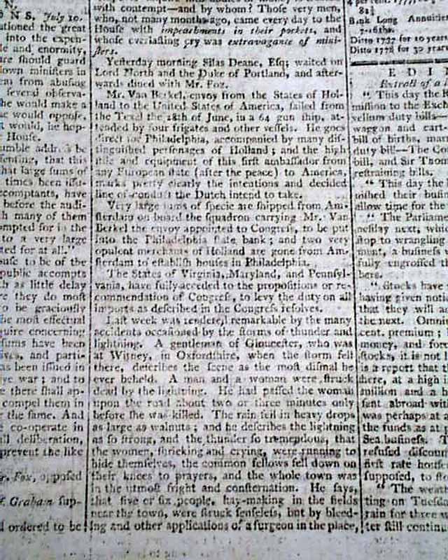 Inside includes a report: "Mr. Van Berkel, envoy from the States of Holland to the U.S. of America...He goes direct for Philadelphia, accompanied by many distinguished personages...and the high stile...of this first ambassador from any European state (after the peace) to America, marks pretty clearly the intentions & decided line of conduct the Dutch intend to take."