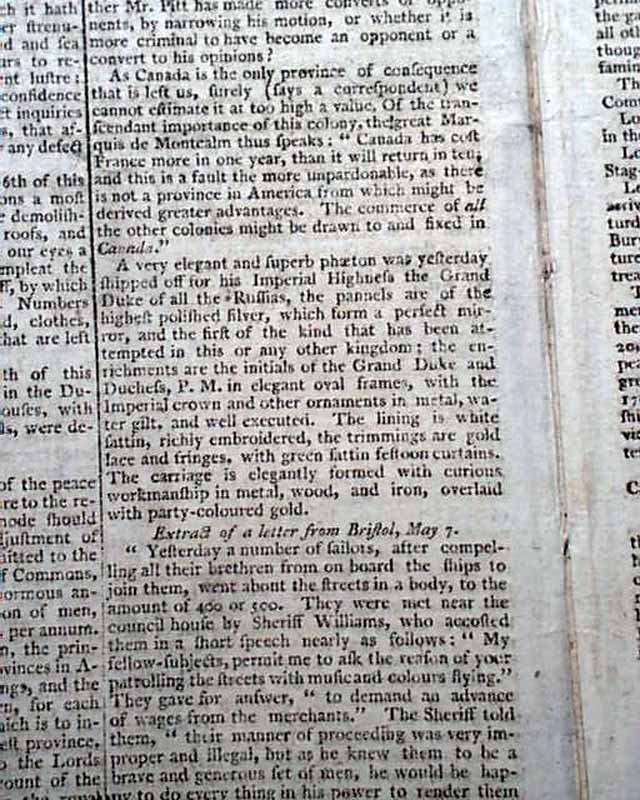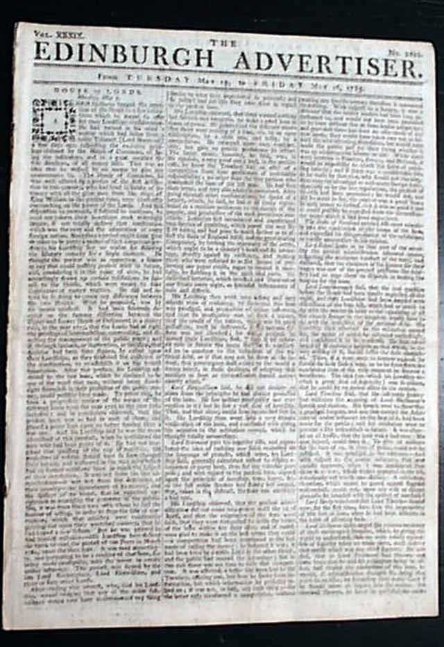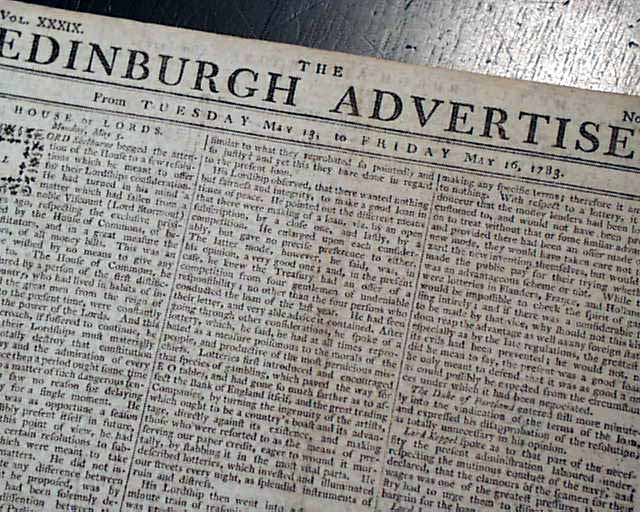 THE EDINBURGH ADVERTISER, Scotland, May 16, 1783 Inside includes, from London: "Government, since the ratification of the peace with America, have indicated their desire to the refugees from that country, that some mode should be struck out for producing a final adjustment of this complex business...". More on this, with further on: "As Canada is the only province of consequence that is left us, surely...we cannot estimate it at too high a value...".