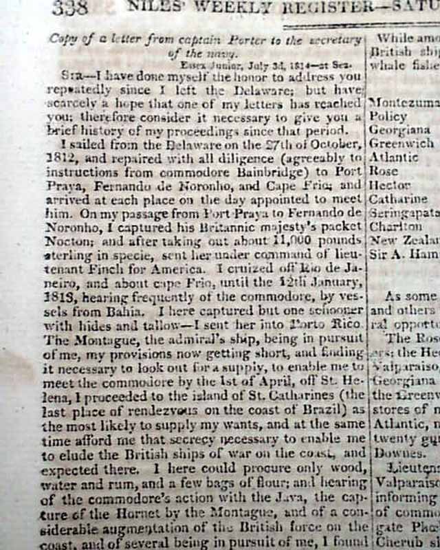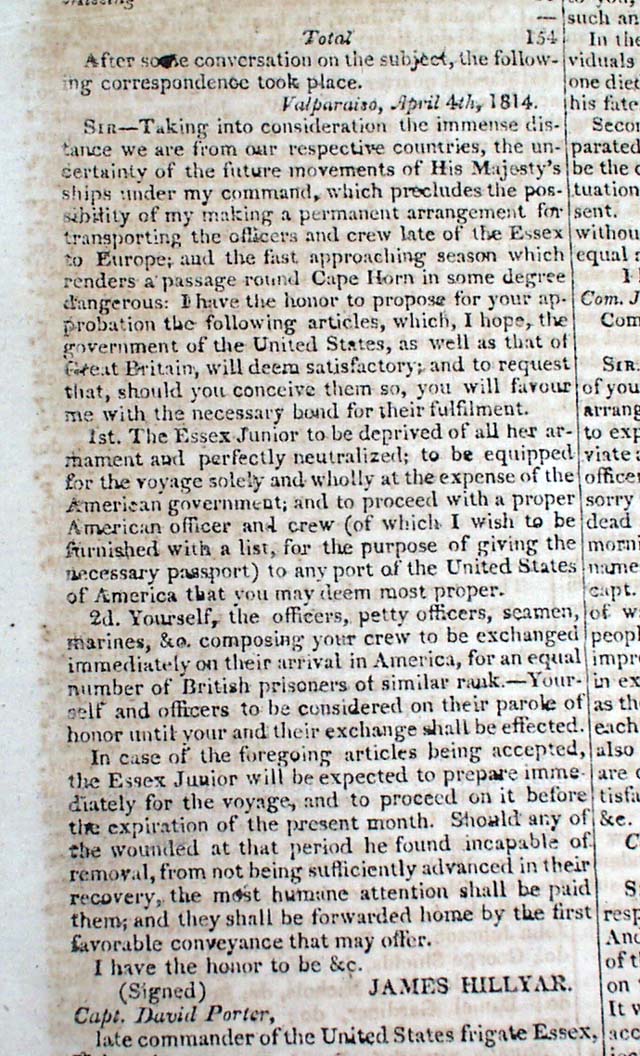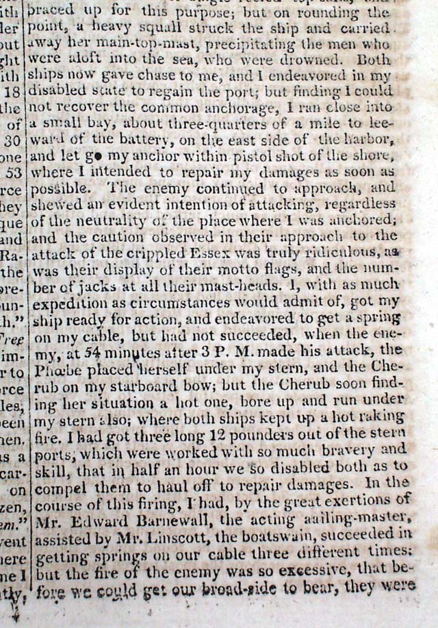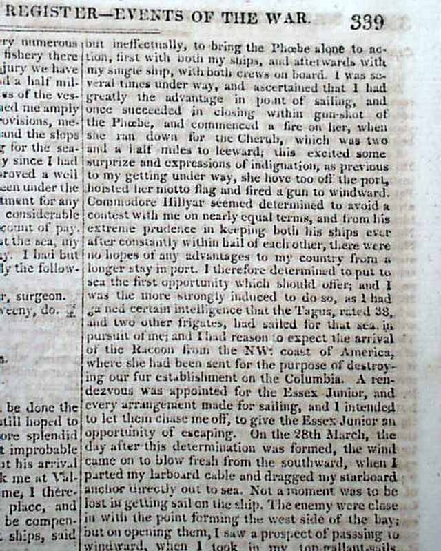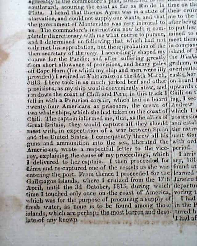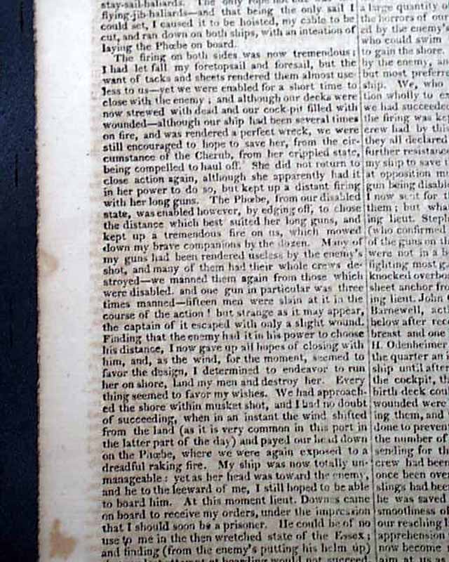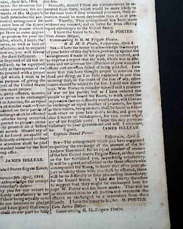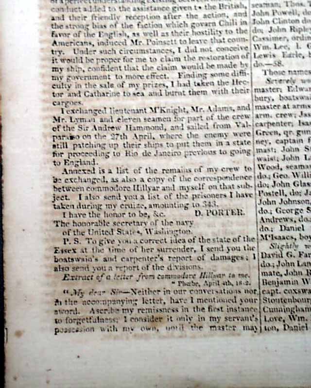 But the most significant content is the report from Captain David Porter on his naval battle off Valparaiso which caused the loss of his ship the Essex, with terrific detail and taking over 4 pages. Included is a report on the killed, wounded & missing which takes over a full column. And there are also several signed correspondences between D. Porter & the British commander James Hillyar concerning the ultimate surrender.