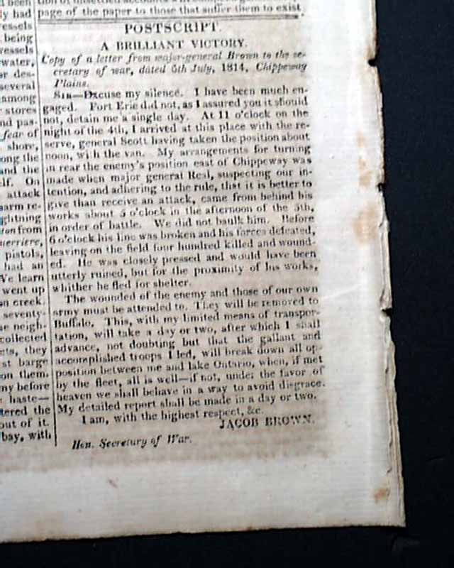 The back page has: "A Brilliant Victory" which is a letter signed in type by Jacob Brown concerning the battle of Chippawa, with a brief reference to his victory at Fort Erie two days before.