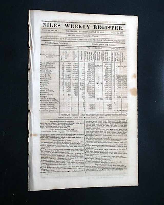 THE WEEKLY REGISTER, Baltimore, July 16, 1814 The first several pages have much on American manufactures with various charts, including "Manufactures from Seed".