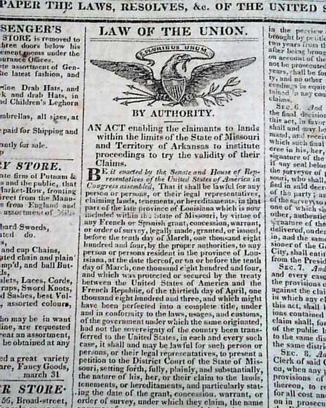 COLUMBIAN CENTINEL, Boston, June 9, 1824 The front page has an Act of Congress: "An Act Enabling the Claimants to lands Within the Limits of the State of Missouri and Territory of Arkansas in institute Proceedings to try the Validity of their Claims".