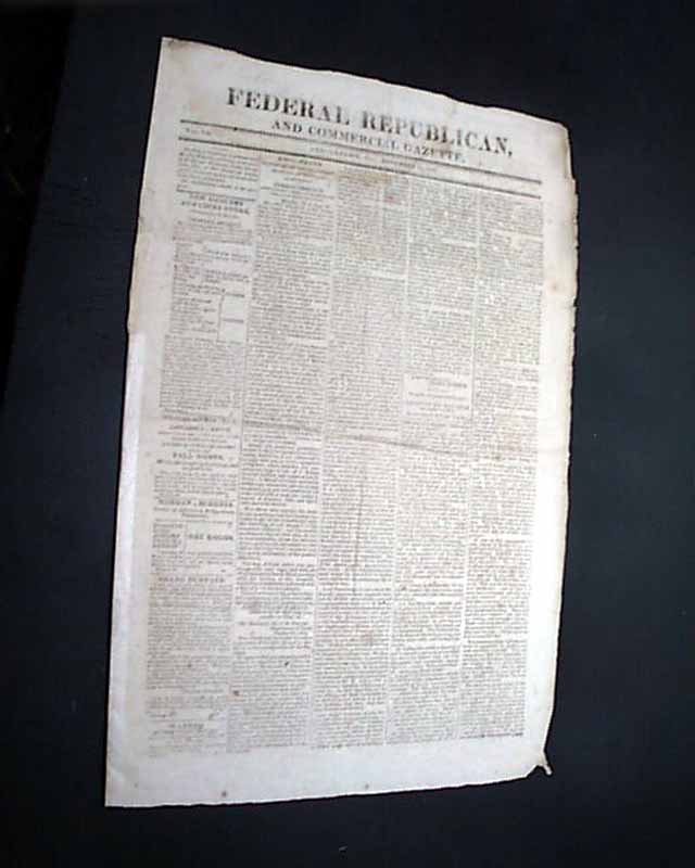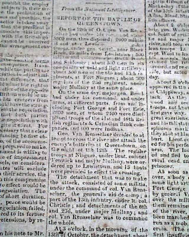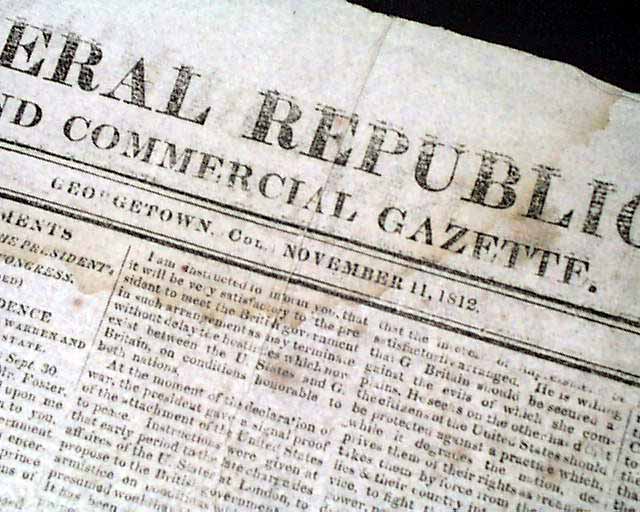 FEDERAL REPUBLICAN & COMMERCIAL GAZETTE, Georgetown, (District of Columbia), Nov. 11, 1812 From the War of 1812 with the front page have a lengthy document signed y the President; James Monroe". This is followed by: "Reports of the Battle of Queenstown [Queenston Heights, Ontario]".