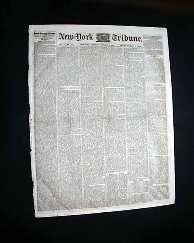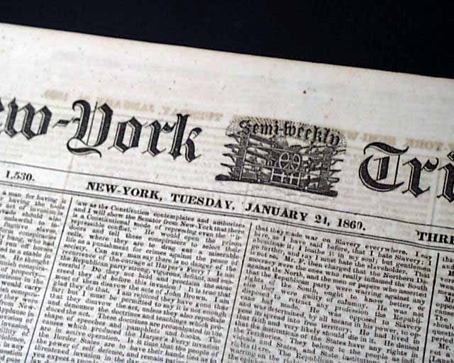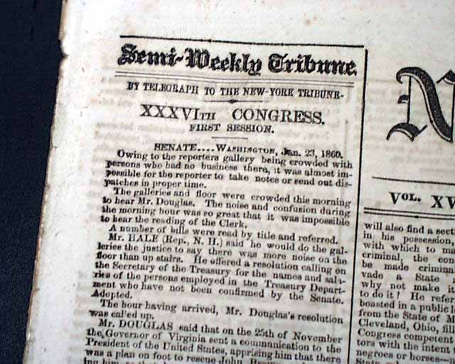 NEW YORK SEMI-WEEKLY TRIBUNE, Jan. 24, 1860 There is considerable reporting on the slavery issue, with a few mentions of Abraham Lincoln. However, of particular significance is the front page, column two re-printing of a portion of Lincoln's very famous speech in 1858 during the Lincoln-Douglas debates. During a speech on the Senate floor, Senator Douglas, speaking of Lincoln, states in part: "...When he returned to Illinois in 1858, to canvas the state, he had to meet this 'irrepressible conflict.' True, the Senator from New York had not made his Rochester speech...He wished to call attention to a single passage in a speech by Mr. Lincoln, who was nominated for the U.S. Senate by the Republican Convention, and which speech had been previously written & agreed to in caucus by most of the lasers of the party: 'In my opinion, the slavery agitation will not cease till the crisis shall have been reached and passed. A House divided against itself cannot stand. I believe this Union cannot endure permanently half slave and half free...", with a bit more on Lincoln's historic speech.