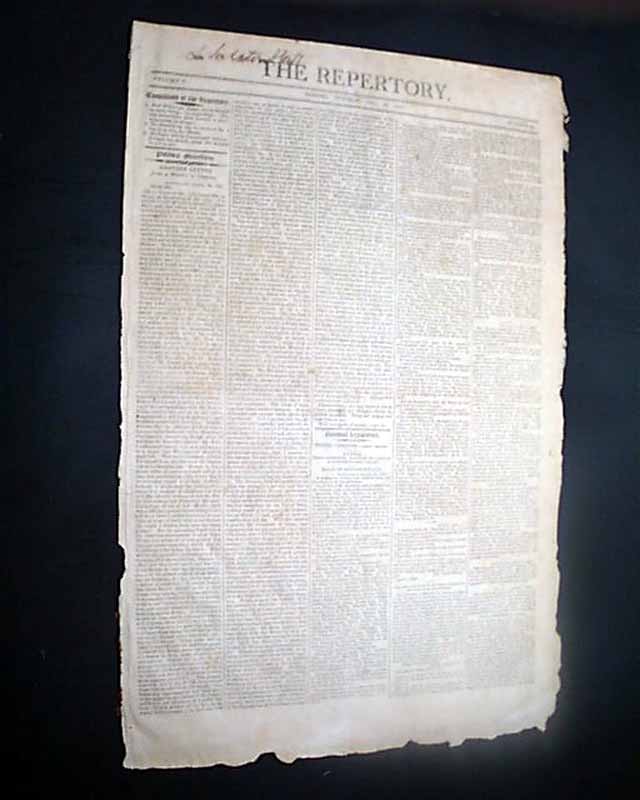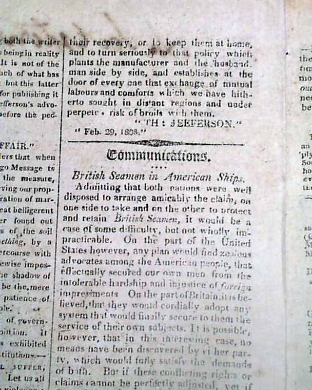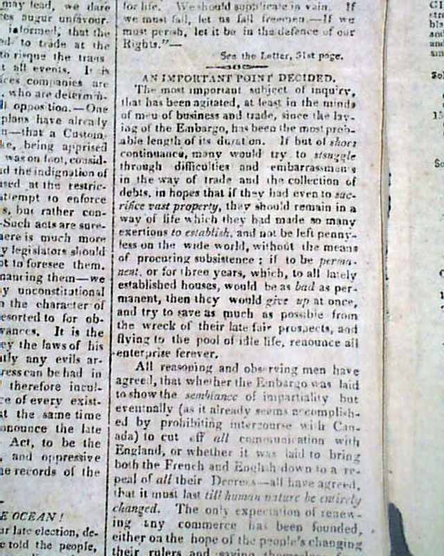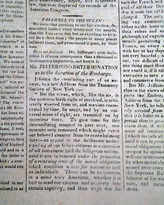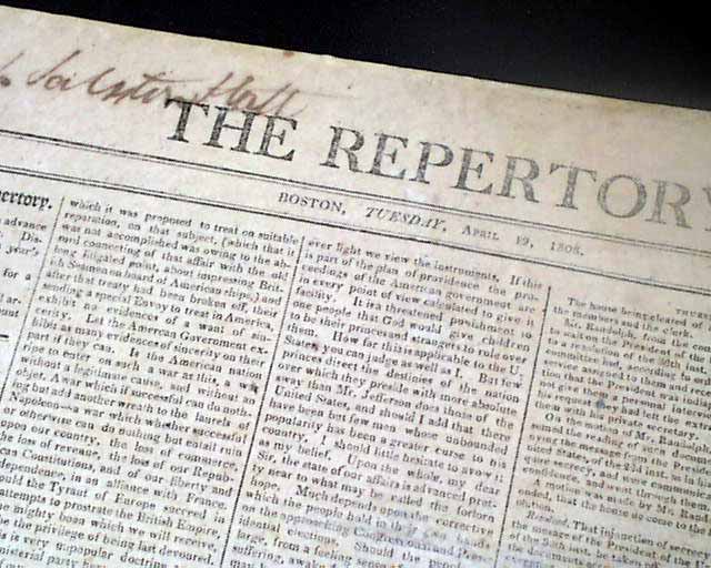 THE REPERTORY, Boston, April 19, 1808 Page 2 has much on the latest supplement to the Embargo Act of Thomas Jefferson's, with: "A Hint to Mr. Jefferson" "Mr. Jefferson's Determination as to the Duration of the Embargo" "An Important Point Decided" and a bit more.