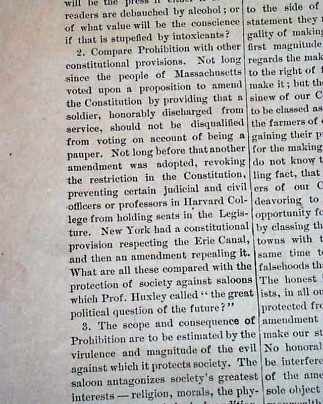 As the title would suggest, the cause of this newspaper is the prohibition of alcohol. The masthead notes: "Published Monthly by the Massachusetts Total Abstinence Society". The content is almost entirely taken up with this focus.