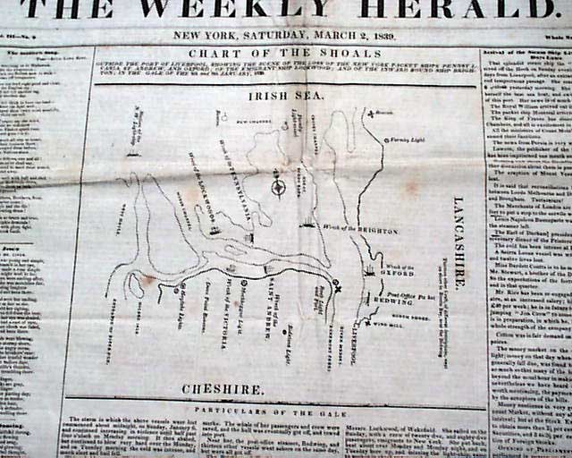 THE WEEKLY HERALD, New York, March 2, 1839 The front page is dominated by a map headed: "Chart OF The Shoals Outside the port of Liverpool..." showing the loss of several American ships from a recent gale.