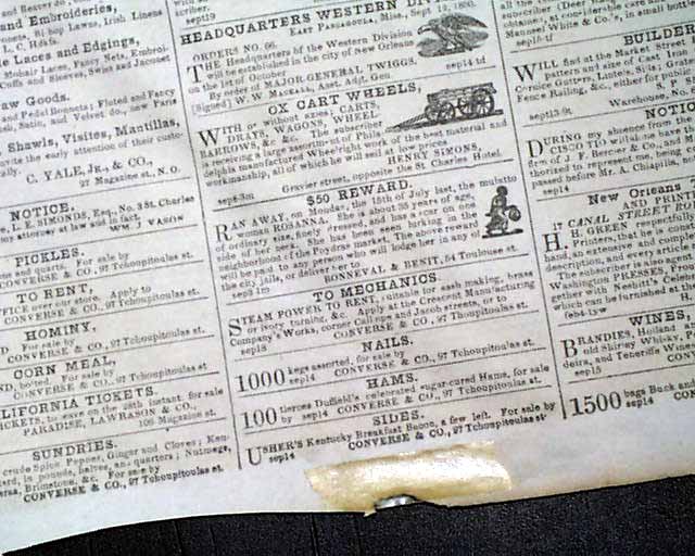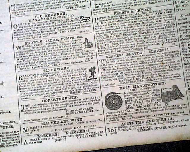 The front page has an illustrated ad: "$20 Reward" for a runaway mulatto boy. Also of interest is a front page ad headed: "Slaves! Slaves!! Slaves!!!" which notes in part: "The subscribers are prepared to receive, on consignment, for sale in this market, any number of slaves, having one of the best showrooms in the city, & large & comfortable quarters where every attention will be paid to their comfort. Merchants, planters, and families having slaves to dispose of will find it to their interest to place them in our charge..." with a bit more.