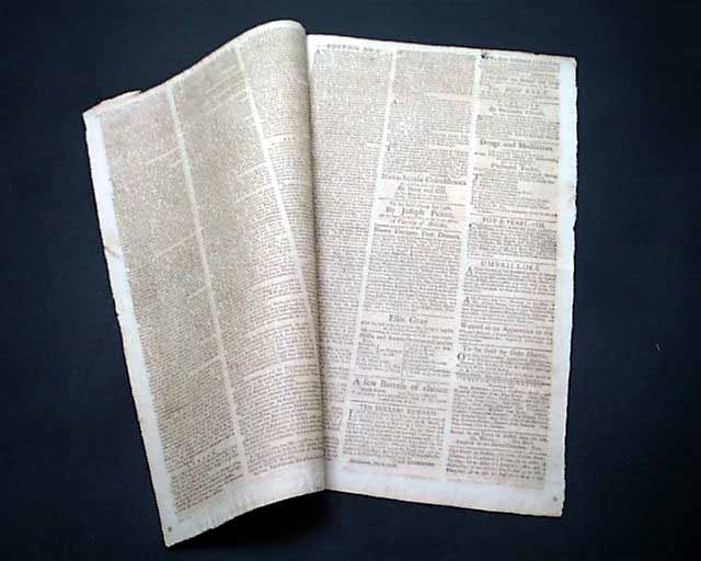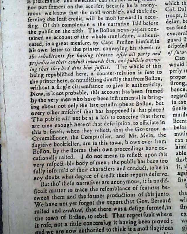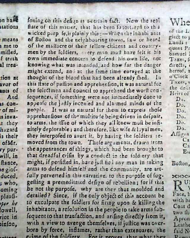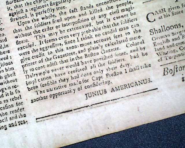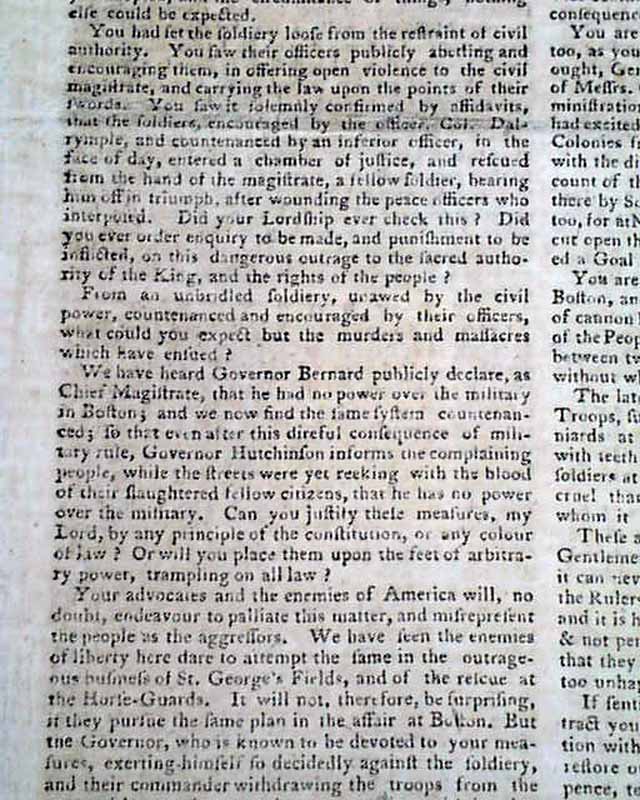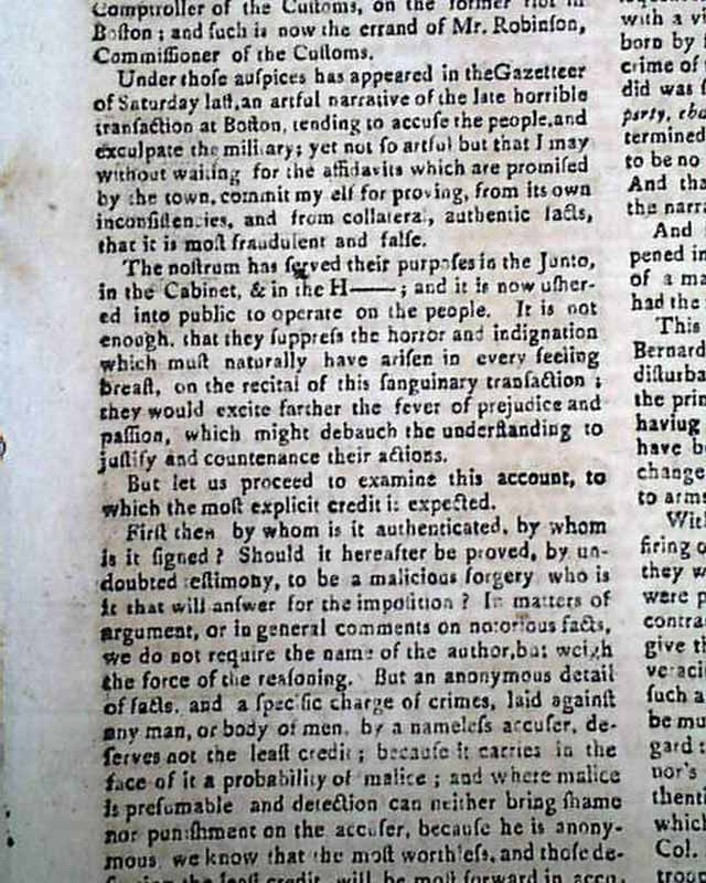 The front page begins with an angry letter signed by: "Junius Americanus" which includes: "A very melancholy occasion calls upon me to review my address to your Lordship. How long do you mean to insult our patience? How long do you mean to trample on our rights...It is not now a time to ask, whether you mean to urge this iniquitous business to the horrible extremity of shedding blood. The streets of Boston are already flowing with blood, wantly, cruelly...We are only to ask how much slaughter, how many inhuman massacres, will satiate your vengeance?. The last advices from Boston bring an account of a military execution on the citizens that must fill every feeling breast with astonishment, indignation, and horror. We there see the soldiery, without provocation attacking, stabbing and cutting the inhabitants with their swords & firing upon them regularly...Three men fell immediate sacrifices to this inhuman outrage; and many others are mortally or dangerously wounded..." with much more, taking over one-third of the front page.