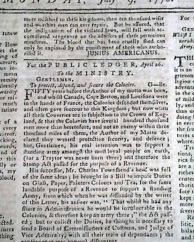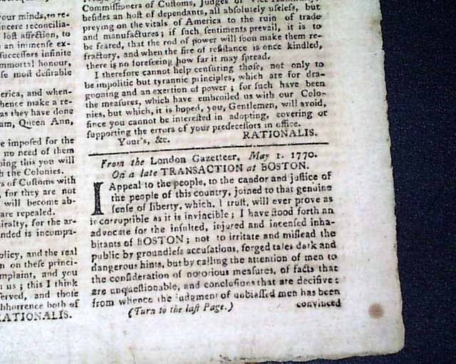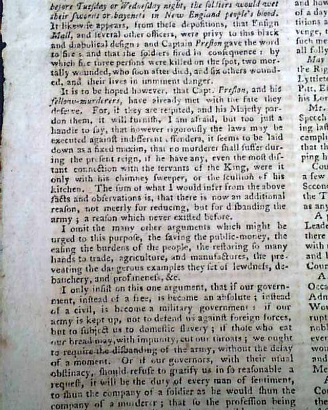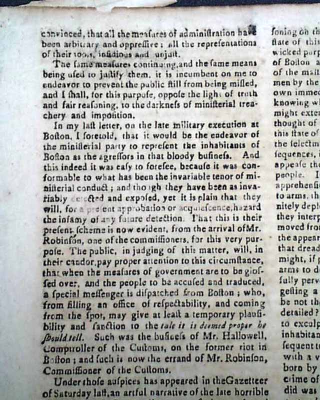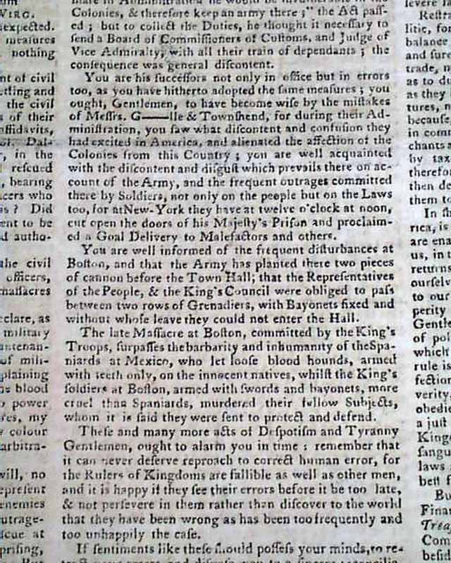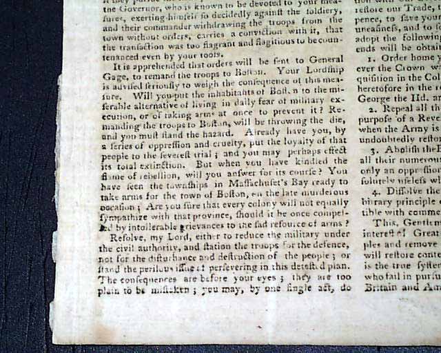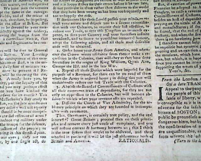 Such content continues on the front page with another one-third page letter "To the Ministry" which includes in part: "...You are well informed of the frequent disturbances at Boston, and that the Army has planted there two pieces of cannon before the Town Hall...The late Massacre at Boston, committed by the King's troops, surpasses the barbarity & inhumanity of the Spaniards at Mexico..." with more. Then it continues with a list of 4 items for reconciling with the Colonies, including; "Order home your Army from America...Repeal all those duties which were imposed for the purpose of a revenue...Abolish the Board of Commissioners of Customs...Dissolve the Courts of Vice Admiralty...".