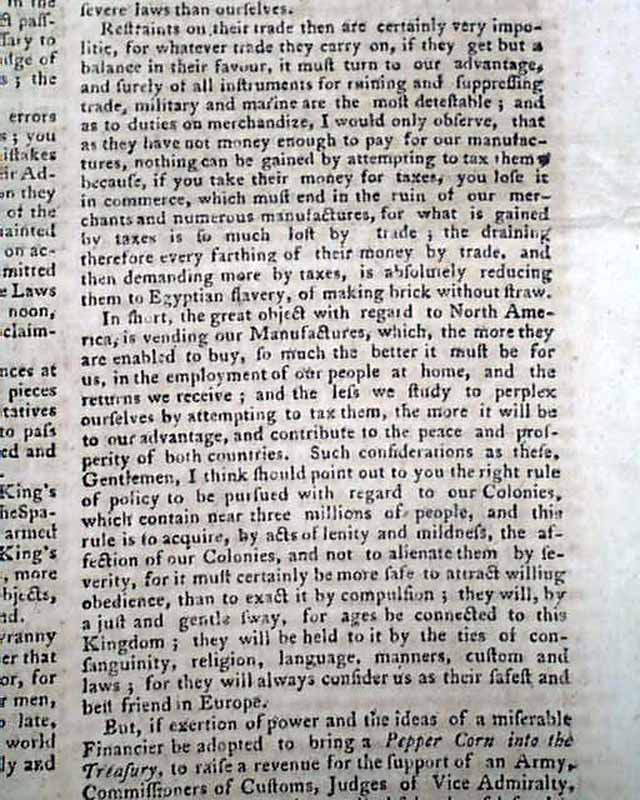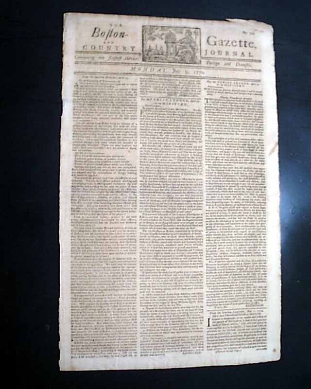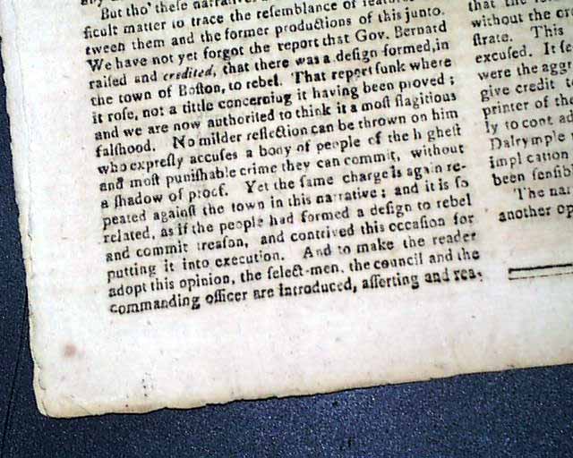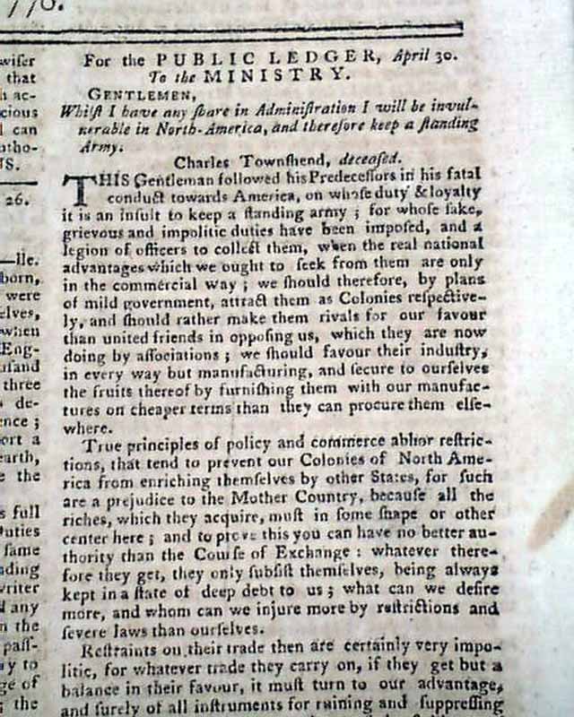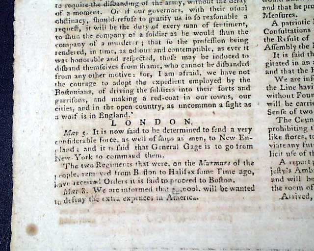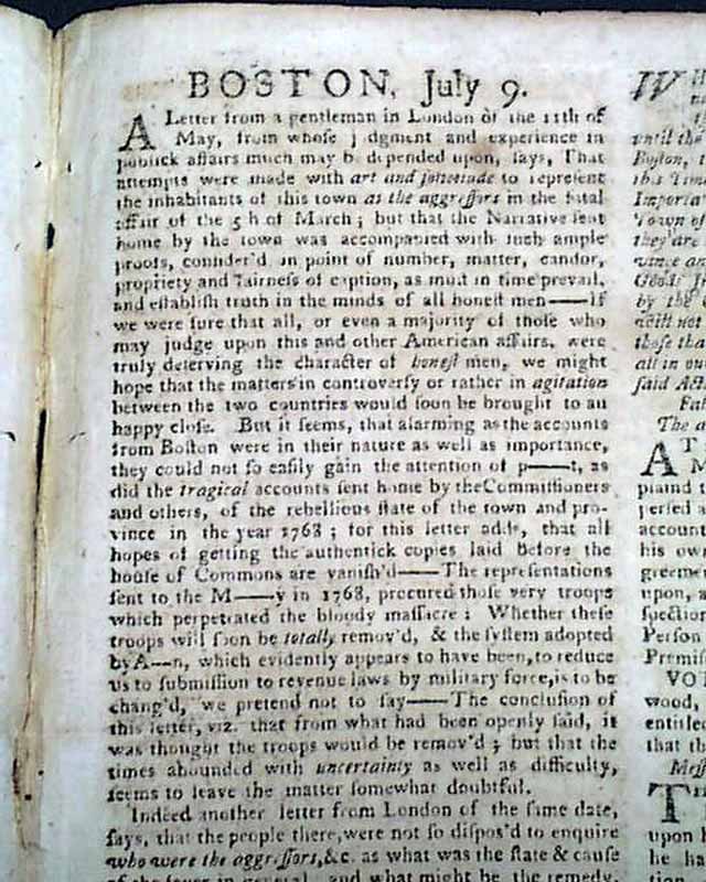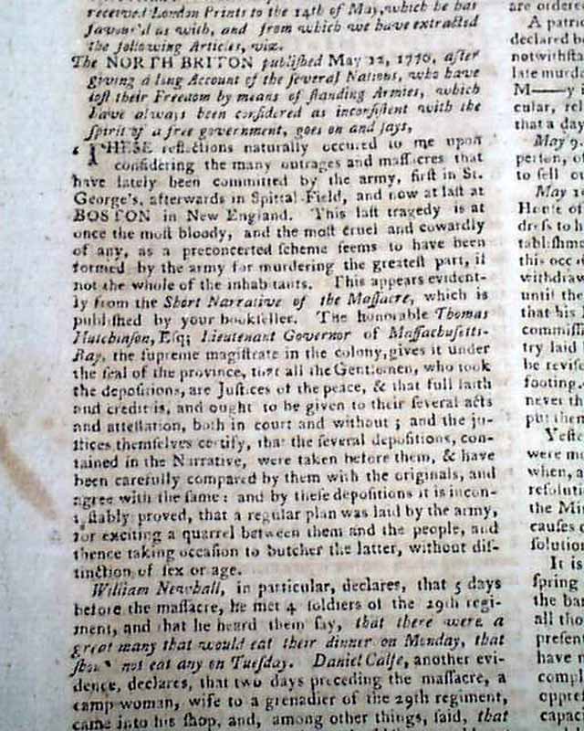 Such content continues on the front page with another one-third page letter "To the Ministry" which includes in part: "...You are well informed of the frequent disturbances at Boston, and that the Army has planted there two pieces of cannon before the Town Hall...The late Massacre at Boston, committed by the King's troops, surpasses the barbarity & inhumanity of the Spaniards at Mexico..." with more. Then it continues with a list of 4 items for reconciling with the Colonies, including; "Order home your Army from America...Repeal all those duties which were imposed for the purpose of a revenue...Abolish the Board of Commissioners of Customs...Dissolve the Courts of Vice Admiralty...".